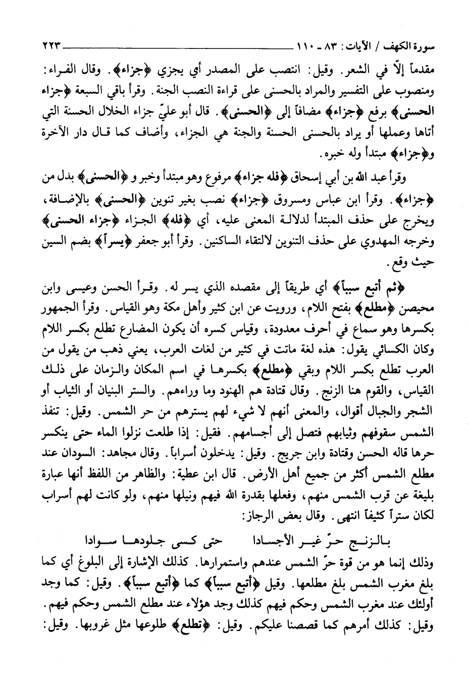 ثُمَّ أَتْبَعَ سَبَباً أَيْ طَرِيقًا إِلَى مَقْصِدِهِ الَّذِي يُسِّرَ لَهُ. وَقَرَأَ الْحَسَنُ وَعِيسَى وَابْنُ مُحَيْصِنٍ مَطْلِعَ بِفَتْحِ اللَّامِ، وَرُوِيَتْ عَنِ ابْنِ كَثِيرٍ وَأَهْلِ مكة وَهُوَ الْقِيَاسُ. وَقَرَأَ الْجُمْهُورُ بِكَسْرِهَا وَهُوَ سَمَاعٌ فِي أَحْرُفٍ مَعْدُودَةٍ، وَقِيَاسُ كَسْرِهِ أَنْ يَكُونَ الْمُضَارِعُ تَطْلِعُ بِكَسْرِ اللَّامِ وَكَانَ الْكِسَائِيُّ يَقُولُ: هَذِهِ لُغَةٌ مَاتَتْ فِي كَثِيرٍ مِنْ لُغَاتِ الْعَرَبِ، يَعْنِي ذَهَبَ مَنْ يَقُولُ مِنَ الْعَرَبِ تَطْلِعُ بِكَسْرِ اللَّامِ وَبَقِيَ مَطْلِعَ بِكَسْرِهَا فِي اسْمِ الْمَكَانِ وَالزَّمَانِ عَلَى ذَلِكَ الْقِيَاسِ، وَالْقَوْمُ هُنَا الزِّنْجُ. وَقَالَ قَتَادَةُ هُمُ الْهُنُودُ وَمَا وَرَاءَهُمْ. وَالسِّتْرُ الْبُنْيَانُ أَوِ الثِّيَابُ أَوِ الشَّجَرُ وَالْجِبَالُ أَقْوَالٌ، وَالْمَعْنَى أَنَّهُمْ لَا شَيْءَ لَهُمْ يَسْتُرُهُمْ مِنْ حَرِّ الشَّمْسِ. وَقِيلَ: تَنْفُذُ الشَّمْسُ سُقُوفَهُمْ وَثِيَابَهُمْ فَتَصِلُ إِلَى أَجْسَامِهِمْ. فَقِيلَ: إِذَا طَلَعَتْ نَزَلُوا الْمَاءَ حَتَّى يَنْكَسِرَ حَرُّهَا قَالَهُ الْحَسَنُ وَقَتَادَةُ وَابْنُ جُرَيْجٍ. وَقِيلَ: يَدْخُلُونَ أَسْرَابًا. وَقَالَ مُجَاهِدٌ: السُّودَانُ عِنْدَ مَطْلَعِ الشَّمْسِ أَكْثَرُ مِنْ جَمِيعِ أَهْلِ الْأَرْضِ. قَالَ ابْنُ عَطِيَّةَ: وَالظَّاهِرُ مِنَ اللَّفْظِ أَنَّهَا عِبَارَةٌ بَلِيغَةٌ عَنْ قُرْبِ الشَّمْسِ مِنْهُمْ، وَفِعْلُهَا بِقُدْرَةِ اللَّهِ فِيهِمْ وَنَيْلُهَا مِنْهُمْ، وَلَوْ كَانَتْ لَهُمْ أَسْرَابٌ لَكَانَ سِتْرًا كَثِيفًا انْتَهَى. وَقَالَ بَعْضُ الرُّجَّازِ: