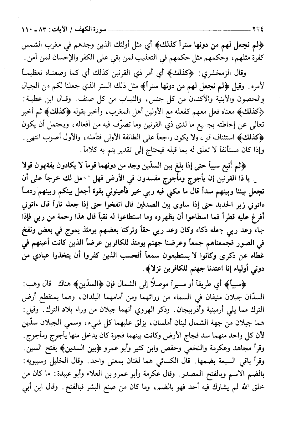ثُمَّ أَتْبَعَ سَبَباً حَتَّى إِذا بَلَغَ بَيْنَ السَّدَّيْنِ وَجَدَ مِنْ دُونِهِما قَوْماً لَا يَكادُونَ يَفْقَهُونَ قَوْلًا قالُوا يَا ذَا الْقَرْنَيْنِ إِنَّ يَأْجُوجَ وَمَأْجُوجَ مُفْسِدُونَ فِي الْأَرْضِ فَهَلْ نَجْعَلُ لَكَ خَرْجاً عَلى أَنْ تَجْعَلَ بَيْنَنا وَبَيْنَهُمْ سَدًّا قالَ مَا مَكَّنِّي فِيهِ رَبِّي خَيْرٌ فَأَعِينُونِي بِقُوَّةٍ أَجْعَلْ بَيْنَكُمْ وَبَيْنَهُمْ رَدْماً آتُونِي زُبَرَ الْحَدِيدِ حَتَّى إِذا سَاوَى بَيْنَ الصَّدَفَيْنِ قالَ انْفُخُوا حَتَّى إِذا جَعَلَهُ نَارًا قالَ آتُونِي أُفْرِغْ عَلَيْهِ قِطْراً فَمَا اسْطاعُوا أَنْ يَظْهَرُوهُ وَمَا اسْتَطاعُوا لَهُ نَقْباً قالَ هَذَا رَحْمَةٌ مِنْ رَبِّي فَإِذا جاءَ وَعْدُ رَبِّي جَعَلَهُ دَكَّاءَ وَكانَ وَعْدُ رَبِّي حَقًّا وَتَرَكْنا بَعْضَهُمْ يَوْمَئِذٍ يَمُوجُ فِي بَعْضٍ وَنُفِخَ فِي الصُّورِ فَجَمَعْناهُمْ جَمْعاً وَعَرَضْنا جَهَنَّمَ يَوْمَئِذٍ لِلْكافِرِينَ عَرْضاً الَّذِينَ كانَتْ أَعْيُنُهُمْ فِي غِطاءٍ عَنْ ذِكْرِي وَكانُوا لَا يَسْتَطِيعُونَ سَمْعاً أَفَحَسِبَ الَّذِينَ كَفَرُوا أَنْ يَتَّخِذُوا عِبادِي مِنْ دُونِي أَوْلِياءَ إِنَّا أَعْتَدْنا جَهَنَّمَ لِلْكافِرِينَ نُزُلًا.