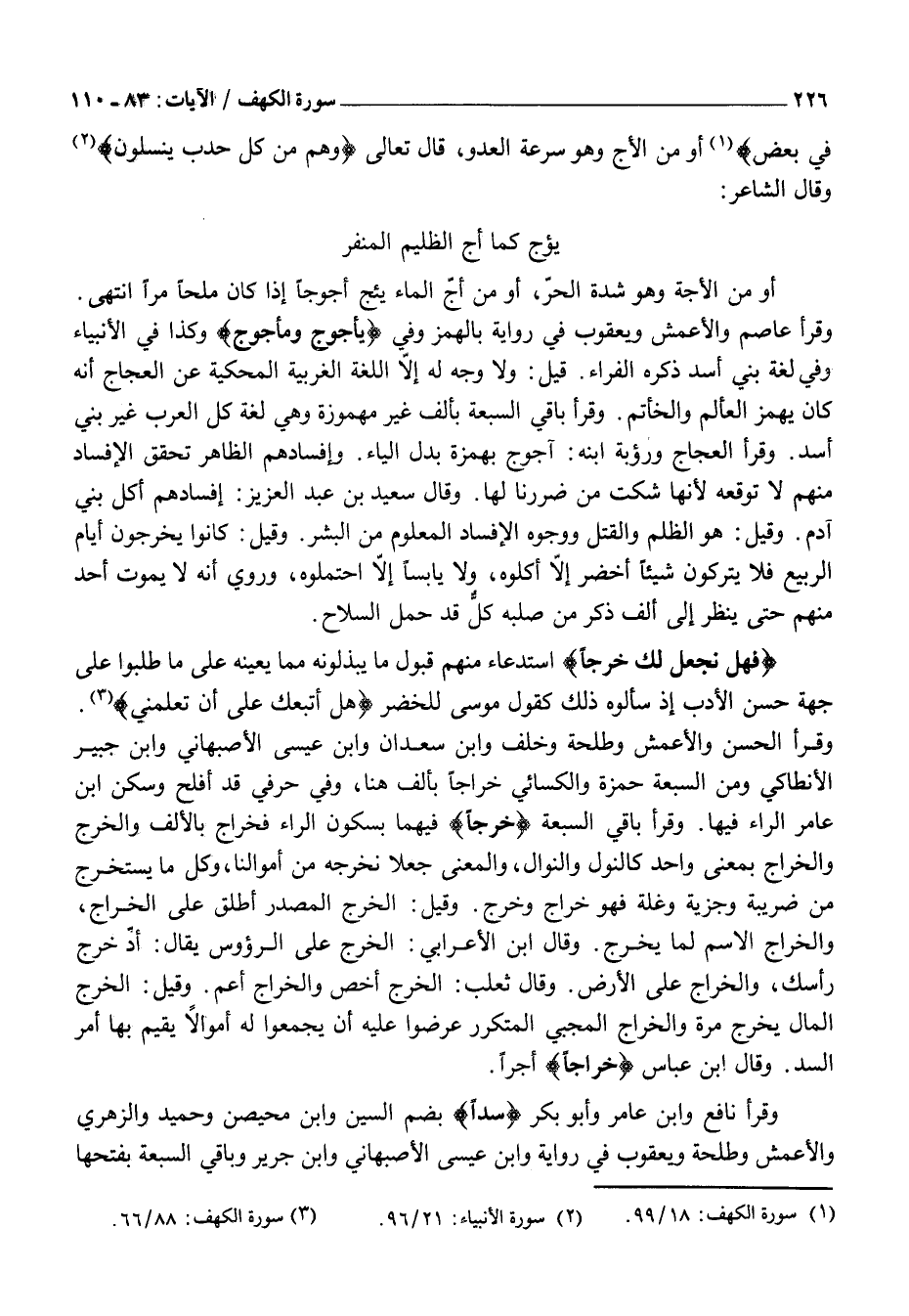 وَقَرَأَ عَاصِمٌ وَالْأَعْمَشُ وَيَعْقُوبُ فِي رِوَايَةٍ بِالْهَمْزِ وَفِي يَأْجُوجَ وَمَأْجُوجَ وَكَذَا فِي الْأَنْبِيَاءِ وَفِي لُغَةِ بَنِي أَسَدٍ ذَكَرَهُ الْفَرَّاءُ. قِيلَ: وَلَا وَجْهَ لَهُ إِلَّا اللُّغَةُ الغربية الْمَحْكِيَّةُ عَنِ الْعَجَّاجِ أَنَّهُ كَانَ يَهْمِزُ الْعَأْلَمَ وَالْخَأْتَمَ. وَقَرَأَ بَاقِي السَّبْعَةِ بِأَلِفٍ غَيْرِ مَهْمُوزَةٍ وَهِيَ لُغَةُ كُلِّ الْعَرَبِ غَيْرَ بَنِي أَسَدٍ. وَقَرَأَ الْعَجَّاجُ وَرُؤْبَةُ ابْنُهُ: آجُوجُ بِهَمْزَةٍ بَدَلَ الْيَاءِ. وَإِفْسَادُهُمُ الظَّاهِرُ تَحَقُّقُ الْإِفْسَادِ مِنْهُمْ لَا تَوَقُّعُهُ لأنها شكت من ضررنا لها. وَقَالَ سَعِيدُ بْنُ عَبْدِ الْعَزِيزِ: إِفْسَادُهُمْ أَكْلُ بَنِي آدَمَ. وَقِيلَ: هُوَ الظُّلْمُ وَالْقَتْلُ وَوُجُوهُ الْإِفْسَادِ الْمَعْلُومِ مِنَ الْبَشَرِ. وَقِيلَ: كَانُوا يَخْرُجُونَ أَيَّامَ الرَّبِيعِ فَلَا يَتْرُكُونَ شَيْئًا أَخْضَرَ إِلَّا أَكَلُوهُ، وَلَا يَابِسًا إِلَّا احْتَمَلُوهُ، وَرُوِيَ أَنَّهُ لَا يَمُوتُ أَحَدٌ مِنْهُمْ حَتَّى يَنْظُرَ إِلَى أَلْفِ ذَكَرٍ مِنْ صُلْبِهِ كُلٌّ قَدْ حَمَلَ السِّلَاحَ.
