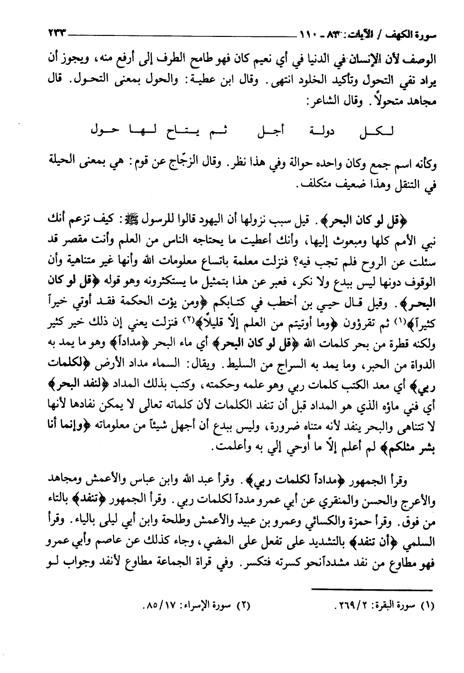 مُعْلِمَةً بِاتِّسَاعِ مَعْلُومَاتِ اللَّهِ وَأَنَّهَا غَيْرُ مُتَنَاهِيَةٍ وَأَنَّ الْوُقُوفَ دُونَهَا لَيْسَ بِبِدْعٍ وَلَا نُكْرٍ، فَعَبَّرَ عَنْ هَذَا بِتَمْثِيلِ مَا يَسْتَكْثِرُونَهُ وَهُوَ قَوْلُهُ قُلْ لَوْ كانَ الْبَحْرُ. وَقِيلَ قَالَ حُيَيُّ بْنُ أَخْطَبَ فِي كِتَابِكُمْ وَمَنْ يُؤْتَ الْحِكْمَةَ فَقَدْ أُوتِيَ خَيْراً كَثِيراً «1» ثُمَّ تَقْرَءُونَ وَما أُوتِيتُمْ مِنَ الْعِلْمِ إِلَّا قَلِيلًا «2» فَنَزَلَتْ يَعْنِي إِنَّ ذَلِكَ خَيْرٌ كَثِيرٌ وَلَكِنَّهُ قَطْرَةٌ مِنْ بَحْرِ كَلِمَاتِ اللَّهِ قُلْ لَوْ كانَ الْبَحْرُ أَيْ مَاءُ الْبَحْرِ مِداداً وَهُوَ مَا يُمَدُّ بِهِ الدَّوَاةُ مِنَ الْحِبْرِ، وَمَا يُمَدُّ بِهِ السِّرَاجُ مِنَ السَّلِيطِ. وَيُقَالُ: السَّمَاءُ مِدَادُ الْأَرْضِ لِكَلِماتِ رَبِّي أَيْ مَعَدُّ الْكُتُبِ كَلِمَاتُ رَبِّي وَهُوَ عِلْمُهُ وَحِكْمَتُهُ، وَكُتِبَ بِذَلِكَ الْمِدَادِ لَنَفِدَ الْبَحْرُ أَيْ فَنِيَ مَاؤُهُ الَّذِي هُوَ الْمِدَادُ قَبْلَ أَنْ تَنْفَدَ الْكَلِمَاتُ لِأَنَّ كَلِمَاتِهِ تَعَالَى لَا يُمْكِنُ نَفَادُهَا لِأَنَّهَا لَا تَتَنَاهَى وَالْبَحْرُ يَنْفَدُ لِأَنَّهُ مُتَنَاهٍ ضَرُورَةً، وَلَيْسَ بِبِدْعٍ أَنْ أَجْهَلَ شَيْئًا مِنْ مَعْلُومَاتِهِ وإِنَّما أَنَا بَشَرٌ مِثْلُكُمْ لَمْ أَعْلَمْ إِلَّا مَا أُوحِيَ إِلَيَّ بِهِ وَأُعْلِمْتُ.