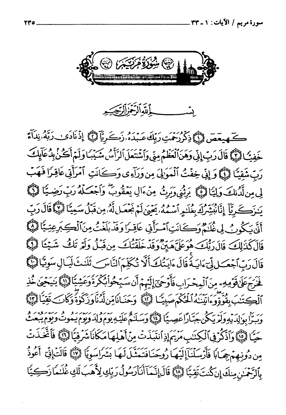 كهيعص (1) ذِكْرُ رَحْمَتِ رَبِّكَ عَبْدَهُ زَكَرِيَّا (2) إِذْ نَادَى رَبَّهُ نِداءً خَفِيًّا (3) قالَ رَبِّ إِنِّي وَهَنَ الْعَظْمُ مِنِّي وَاشْتَعَلَ الرَّأْسُ شَيْباً وَلَمْ أَكُنْ بِدُعائِكَ رَبِّ شَقِيًّا (4)
