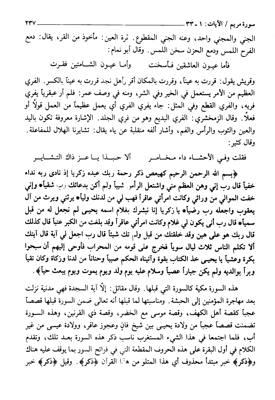 بِسْمِ اللَّهِ الرَّحْمنِ الرَّحِيمِ كهيعص ذِكْرُ رَحْمَتِ رَبِّكَ عَبْدَهُ زَكَرِيَّا إِذْ نَادَى رَبَّهُ نِداءً خَفِيًّا قالَ رَبِّ إِنِّي وَهَنَ الْعَظْمُ مِنِّي وَاشْتَعَلَ الرَّأْسُ شَيْباً وَلَمْ أَكُنْ بِدُعائِكَ رَبِّ شَقِيًّا وَإِنِّي خِفْتُ الْمَوالِيَ مِنْ وَرائِي وَكانَتِ امْرَأَتِي عاقِراً فَهَبْ لِي مِنْ لَدُنْكَ وَلِيًّا يَرِثُنِي وَيَرِثُ مِنْ آلِ يَعْقُوبَ وَاجْعَلْهُ رَبِّ رَضِيًّا يَا زَكَرِيَّا إِنَّا نُبَشِّرُكَ بِغُلامٍ اسْمُهُ يَحْيى لَمْ نَجْعَلْ لَهُ مِنْ قَبْلُ سَمِيًّا قالَ رَبِّ أَنَّى يَكُونُ لِي غُلامٌ وَكانَتِ امْرَأَتِي عاقِراً وَقَدْ بَلَغْتُ مِنَ الْكِبَرِ عِتِيًّا قالَ كَذلِكَ قالَ رَبُّكَ هُوَ عَلَيَّ هَيِّنٌ وَقَدْ خَلَقْتُكَ مِنْ قَبْلُ وَلَمْ تَكُ شَيْئاً قالَ رَبِّ اجْعَلْ لِي آيَةً قالَ آيَتُكَ أَلَّا تُكَلِّمَ النَّاسَ ثَلاثَ لَيالٍ سَوِيًّا فَخَرَجَ عَلى قَوْمِهِ مِنَ الْمِحْرابِ فَأَوْحى إِلَيْهِمْ أَنْ سَبِّحُوا بُكْرَةً وَعَشِيًّا يَا يَحْيى خُذِ الْكِتابَ بِقُوَّةٍ وَآتَيْناهُ الْحُكْمَ صَبِيًّا وَحَناناً مِنْ لَدُنَّا وَزَكاةً وَكانَ تَقِيًّا وَبَرًّا بِوالِدَيْهِ وَلَمْ يَكُنْ جَبَّاراً عَصِيًّا وَسَلامٌ عَلَيْهِ يَوْمَ وُلِدَ وَيَوْمَ يَمُوتُ وَيَوْمَ يُبْعَثُ حَيًّا.