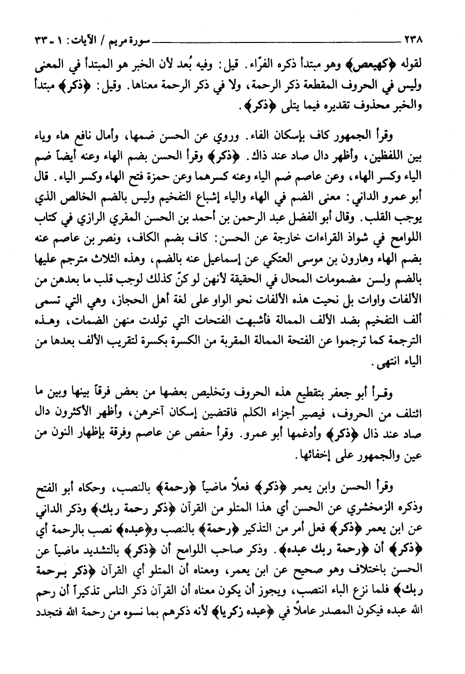 لِقَوْلِهِ كهيعص وَهُوَ مُبْتَدَأٌ ذَكَرَهُ الْفَرَّاءُ. قِيلَ: وَفِيهِ بُعْدٌ لِأَنَّ الْخَبَرَ هُوَ الْمُبْتَدَأُ فِي الْمَعْنَى وَلَيْسَ فِي الْحُرُوفِ الْمُقَطَّعَةِ ذِكْرُ الرَّحْمَةِ، وَلَا فِي ذِكْرِ الرَّحْمَةِ مَعْنَاهَا. وَقِيلَ: ذِكْرُ مُبْتَدَأٌ وَالْخَبَرُ مَحْذُوفٌ تَقْدِيرُهُ فِيمَا يُتْلَى ذِكْرُ.
