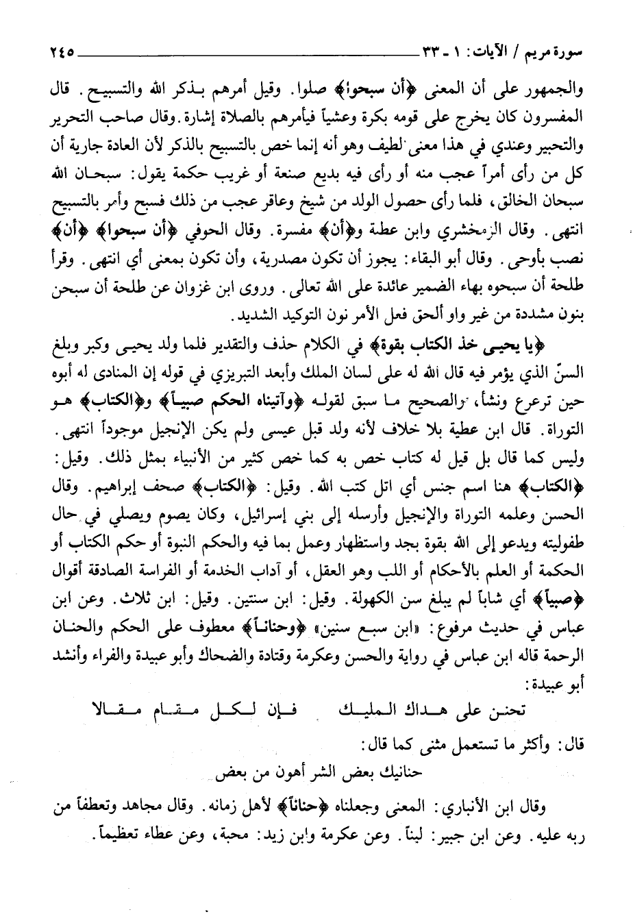 الْكِتابَ هُنَا اسْمُ جِنْسٍ أَيِ اتْلُ كُتُبَ اللَّهِ. وَقِيلَ: الْكِتابَ صُحُفُ إِبْرَاهِيمَ. وَقَالَ الْحَسَنُ وَعَلَّمَهُ التَّوْرَاةَ وَالْإِنْجِيلَ وَأَرْسَلَهُ إِلَى بَنِي إِسْرَائِيلَ، وَكَانَ يَصُومُ وَيُصَلِّي فِي حَالِ طُفُولِيَّتِهِ وَيَدْعُو إِلَى اللَّهِ بِقُوَّةٍ بِجِدٍّ وَاسْتِظْهَارٍ وَعَمَلٍ بِمَا فِيهِ وَالْحُكْمُ النُّبُوَّةُ أَوْ حُكْمُ الْكِتَابِ أَوِ الْحِكْمَةُ أَوِ الْعِلْمُ بِالْأَحْكَامِ أَوِ اللُّبُّ وَهُوَ الْعَقْلُ، أَوْ آدَابُ الْخِدْمَةِ أَوِ الْفِرَاسَةُ الصَّادِقَةُ أَقْوَالٌ صَبِيًّا أَيْ شَابًّا لَمْ يَبْلُغْ سِنَّ الْكُهُولَةِ. وَقِيلَ: ابْنُ سَنَتَيْنِ. وَقِيلَ: ابْنُ ثَلَاثٍ. وَعَنِ ابْنِ عَبَّاسٍ فِي حَدِيثٍ مَرْفُوعٍ: «ابْنُ سَبْعِ سِنِينَ» وَحَناناً مَعْطُوفٌ عَلَى الْحُكْمِ وَالْحَنَانُ الرَّحْمَةُ قَالَهُ ابْنُ عَبَّاسٍ فِي رِوَايَةٍ وَالْحَسَنُ وَعِكْرِمَةُ وَقَتَادَةُ وَالضَّحَّاكُ وَأَبُو عُبَيْدَةَ وَالْفَرَّاءُ وَأَنْشَدَ أَبُو عُبَيْدَةَ: