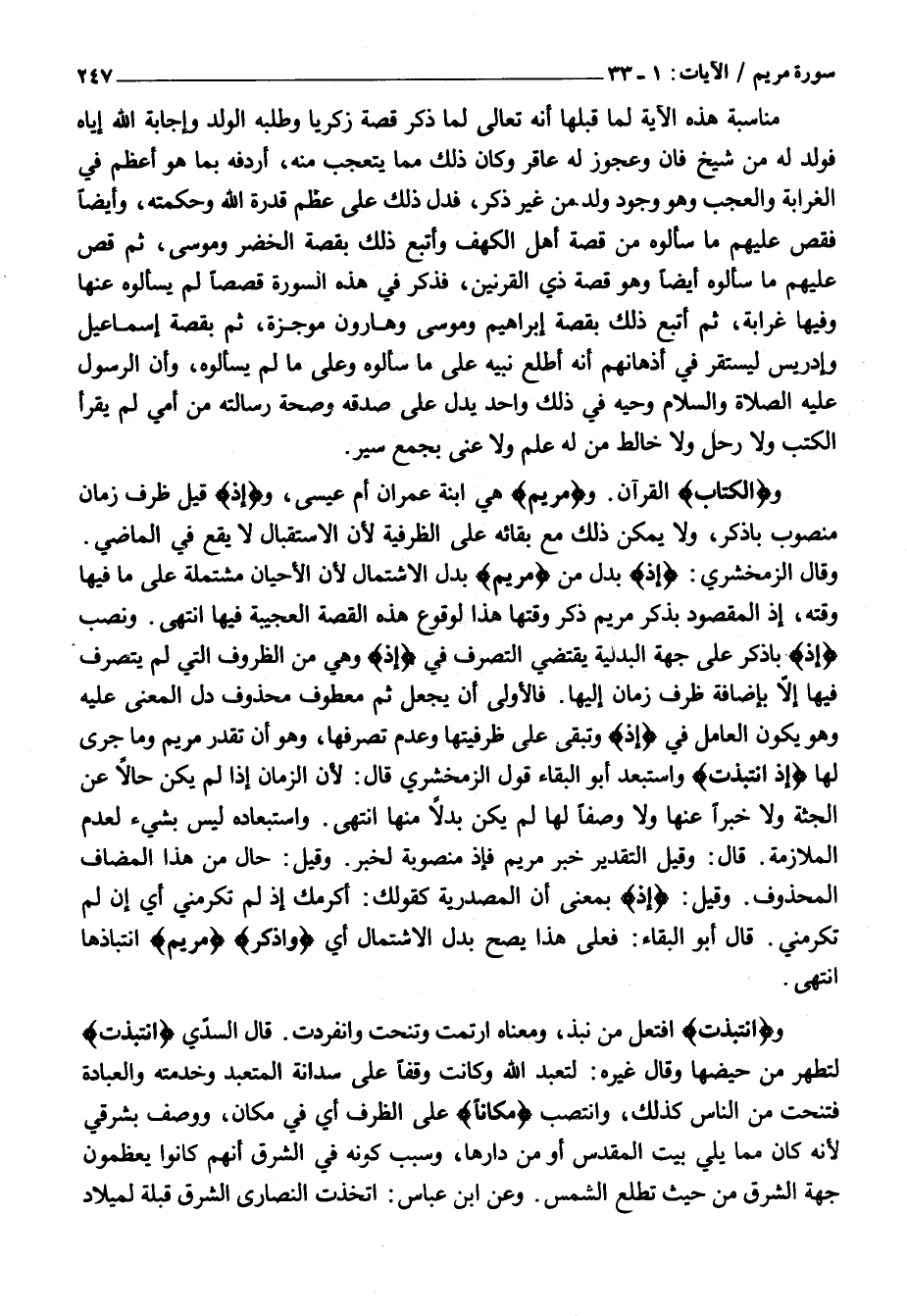 وَتَبْقَى عَلَى ظَرْفِيَّتِهَا وَعَدَمِ تَصَرُّفِهَا، وَهُوَ أَنْ تُقَدَّرَ مَرْيَمُ وَمَا جَرَى لَهَا إِذِ انْتَبَذَتْ