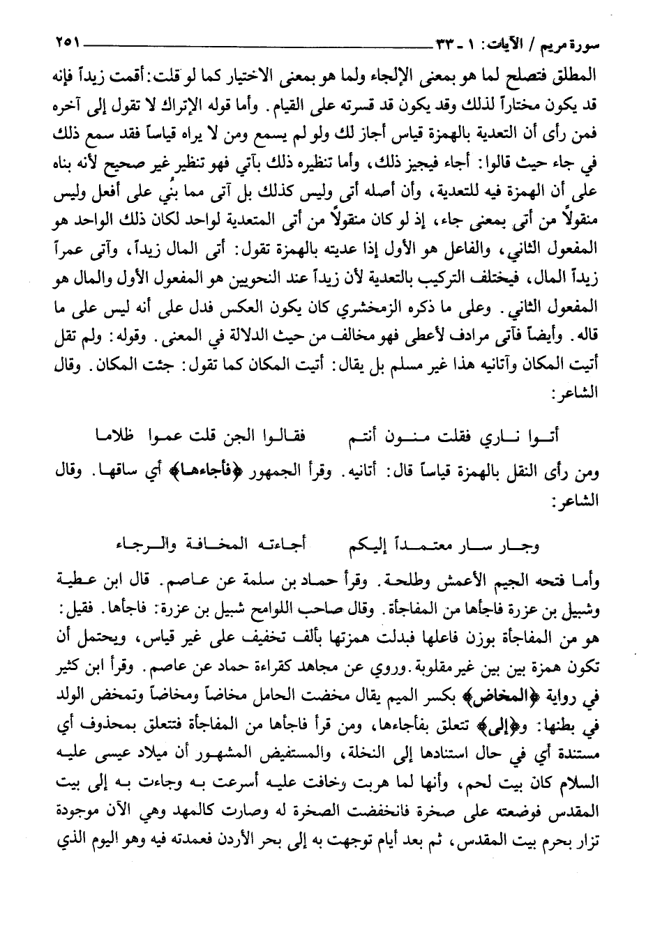 هُوَ مِنَ الْمُفَاجَأَةِ بِوَزْنِ فَاعِلِهَا فَبُدِّلَتْ هَمْزَتُهَا بِأَلِفِ تَخْفِيفٍ عَلَى غَيْرِ قِيَاسٍ، وَيَحْتَمِلُ أَنْ تَكُونَ هَمْزَةً بَيْنَ بَيْنَ غَيْرَ مَقْلُوبَةٍ. وَرُوِيَ عَنْ مُجَاهِدٍ كَقِرَاءَةِ حَمَّادٍ عَنْ عَاصِمٍ. وَقَرَأَ ابْنُ كَثِيرٍ فِي رِوَايَةٍ الْمَخاضُ بِكَسْرِ الْمِيمِ يُقَالُ مَخَضَتِ الْحَامِلُ مَخَاضًا وَمِخَاضًا وَتَمَخَّضَ الولد في بطنها: وإِلى تتعلق بفاجأها، وَمَنْ قَرَأَ فَاجَأَهَا مِنَ الْمُفَاجَأَةِ فَتَتَعَلَّقُ بِمَحْذُوفٍ أَيْ مُسْتَنِدَةٌ أَيْ فِي حَالِ اسْتِنَادِهَا إِلَى النَّخْلَةِ، وَالْمُسْتَفِيضُ الْمَشْهُورُ أَنَّ مِيلَادَ عِيسَى عَلَيْهِ السَّلَامُ كَانَ بَيْتَ لَحْمٍ، وَأَنَّهَا لَمَّا هَرَبَتْ وَخَافَتْ عَلَيْهِ أَسْرَعَتْ بِهِ وَجَاءَتْ بِهِ إِلَى بَيْتِ الْمَقْدِسِ فَوَضَعَتْهُ عَلَى صَخْرَةٍ فَانْخَفَضَتِ الصَّخْرَةُ لَهُ وَصَارَتْ كَالْمَهْدِ وَهِيَ الْآنَ مَوْجُودَةٌ تُزَارُ بِحَرَمِ بَيْتِ الْمَقْدِسِ، ثُمَّ بَعْدَ أَيَّامٍ تَوَجَّهَتْ بِهِ إِلَى بَحْرِ الْأُرْدُنِّ فَعَمَّدَتْهُ فِيهِ وَهُوَ الْيَوْمُ الَّذِي