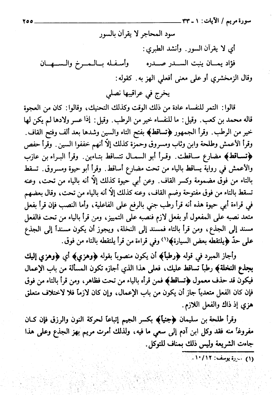 يَخْرُجُ فِي عَرَاقِيبِهَا نَصْلِي قَالُوا: التَّمْرُ لِلنُّفَسَاءِ عَادَةٌ مِنْ ذَلِكَ الْوَقْتِ وَكَذَلِكَ التَّحْنِيكُ، وَقَالُوا: كَانَ مِنَ الْعَجْوَةِ قَالَهُ مُحَمَّدُ بْنُ كَعْبٍ. وَقِيلَ: مَا لِلنُّفَسَاءِ خَيْرٌ مِنَ الرُّطَبِ. وَقِيلَ: إِذَا عَسُرَ وِلَادُهَا لَمْ يَكُنْ لَهَا خَيْرٌ مِنَ الرُّطَبِ. وَقَرَأَ الْجُمْهُورُ تُساقِطْ بِفَتْحِ التَّاءِ وَالسِّينِ وَشَدِّهَا بَعْدَ أَلِفٍ وَفَتْحِ الْقَافِ.