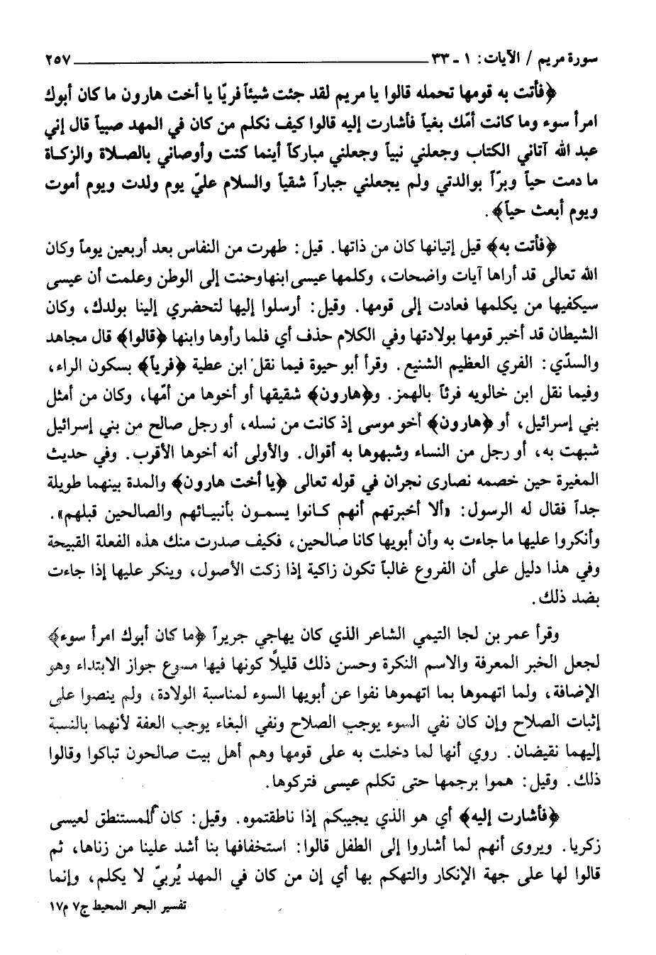 فَأَتَتْ بِهِ قِيلَ إِتْيَانُهَا كَانَ مِنْ ذَاتِهَا. قِيلَ: طَهُرَتْ مِنَ النِّفَاسِ بَعْدَ أَرْبَعِينَ يَوْمًا وَكَانَ اللَّهُ تَعَالَى قَدْ أَرَاهَا آيَاتٍ وَاضِحَاتٍ، وَكَلَّمَهَا عيسى ابنها وَحَنَّتْ إِلَى الْوَطَنِ وَعَلِمَتْ أَنَّ عِيسَى سَيَكْفِيهَا مَنْ يُكَلِّمُهَا فَعَادَتْ إِلَى قَوْمِهَا. وَقِيلَ: أَرْسَلُوا إِلَيْهَا لَتَحْضُرِي إِلَيْنَا بِوَلَدِكِ، وَكَانَ الشَّيْطَانُ قَدْ أَخْبَرَ قَوْمَهَا بِوِلَادَتِهَا وَفِي الْكَلَامِ حَذْفٌ أَيْ فَلَمَّا رَأَوْهَا وَابْنَهَا قالُوا قَالَ مُجَاهِدٌ وَالسُّدِّيُّ: الْفَرِيُّ الْعَظِيمُ الشَّنِيعُ. وَقَرَأَ أَبُو حَيْوَةَ فِيمَا نَقَلَ ابْنُ عَطِيَّةَ فَرِيًّا بِسُكُونِ الرَّاءِ، وَفِيمَا نَقَلَ ابْنُ خَالَوَيْهِ فَرْئًا بِالْهَمْزِ. وهارُونَ شَقِيقُهَا أَوْ أَخُوهَا مِنْ أُمِّهَا، وَكَانَ مِنْ أَمْثَلِ بَنِي إِسْرَائِيلَ، أَوْ هارُونَ أَخُو مُوسَى إِذْ كَانَتْ مِنْ نَسْلِهِ، أَوْ رَجُلٌ صَالِحٌ مِنْ بَنِي إِسْرَائِيلَ شُبِّهَتْ بِهِ، أَوْ رَجُلٌ مِنَ النِّسَاءِ وَشَبَّهُوهَا بِهِ أَقْوَالٌ. وَالْأَوْلَى أَنَّهُ أَخُوهَا الْأَقْرَبُ.
