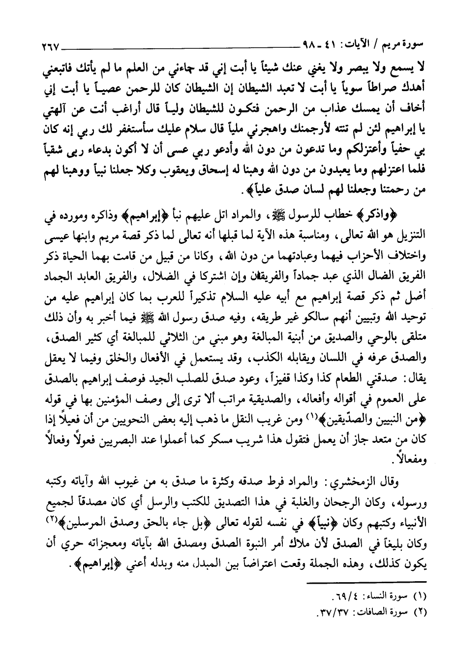 لَا يَسْمَعُ وَلا يُبْصِرُ وَلا يُغْنِي عَنْكَ شَيْئاً يَا أَبَتِ إِنِّي قَدْ جاءَنِي مِنَ الْعِلْمِ مَا لَمْ يَأْتِكَ فَاتَّبِعْنِي أَهْدِكَ صِراطاً سَوِيًّا يَا أَبَتِ لَا تَعْبُدِ الشَّيْطانَ إِنَّ الشَّيْطانَ كانَ لِلرَّحْمنِ عَصِيًّا يَا أَبَتِ إِنِّي أَخافُ أَنْ يَمَسَّكَ عَذابٌ مِنَ الرَّحْمنِ فَتَكُونَ لِلشَّيْطانِ وَلِيًّا قالَ أَراغِبٌ أَنْتَ عَنْ آلِهَتِي يَا إِبْراهِيمُ لَئِنْ لَمْ تَنْتَهِ لَأَرْجُمَنَّكَ وَاهْجُرْنِي مَلِيًّا قالَ سَلامٌ عَلَيْكَ سَأَسْتَغْفِرُ لَكَ رَبِّي إِنَّهُ كانَ بِي حَفِيًّا وَأَعْتَزِلُكُمْ وَما تَدْعُونَ مِنْ دُونِ اللَّهِ وَأَدْعُوا رَبِّي عَسى أَلَّا أَكُونَ بِدُعاءِ رَبِّي شَقِيًّا فَلَمَّا اعْتَزَلَهُمْ وَما يَعْبُدُونَ مِنْ دُونِ اللَّهِ وَهَبْنا لَهُ إِسْحاقَ وَيَعْقُوبَ وَكُلًّا جَعَلْنا نَبِيًّا وَوَهَبْنا لَهُمْ مِنْ رَحْمَتِنا وَجَعَلْنا لَهُمْ لِسانَ صِدْقٍ عَلِيًّا.