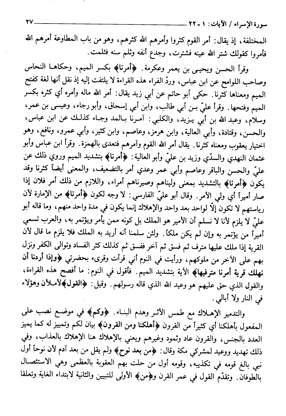 أَمَرْنا بِتَشْدِيدِ الْمِيمِ وَرُوِيَ ذَلِكَ عَنْ عَلِيٍّ وَالْحَسَنِ وَالْبَاقِرِ