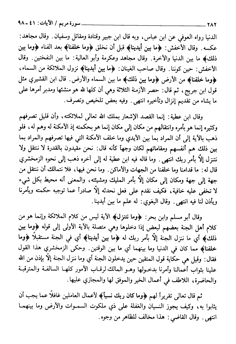 وَقَالَ ابْنُ عَطِيَّةَ: إِنَّمَا الْقَصْدُ الْإِشْعَارُ بِمُلْكِ اللَّهِ تَعَالَى لِمَلَائِكَتِهِ، وَأَنَّ قَلِيلَ تَصَرُّفِهِمْ وَكَثِيرَهُ إِنَّمَا هُوَ بِأَمْرِهِ وَانْتِقَالَهُمْ مِنْ مَكَانٍ إِلَى مَكَانٍ إِنَّمَا هُوَ بِحِكْمَتِهِ إِذِ الْأَمْكِنَةُ لَهُ وَهُمْ لَهُ، فَلَوْ ذَهَبَ بِالْآيَةِ إِلَى أَنَّ الْمُرَادَ بِمَا بَيْنَ الْأَيْدِي وَمَا خَلْفَ الْأَمْكِنَةُ الَّتِي فِيهَا تَصَرُّفُهُمْ وَالْمُرَادُ بِمَا بَيْنَ ذَلِكَ هُمْ أَنْفُسُهُمْ وَمَقَامَاتُهُمْ لَكَانَ وَجْهًا كَأَنَّهُ قَالَ: نَحْنُ مُقَيَّدُونَ بِالْقُدْرَةِ لَا نَنْتَقِلُ وَلَا نَتَنَزَّلُ إِلَّا بِأَمْرِ رَبِّكَ انْتَهَى. وَمَا قَالَهُ فِيهِ ابْنُ عَطِيَّةَ لَهُ إِلَى آخِرِهِ ذَهَبَ إِلَى نَحْوِهِ الزَّمَخْشَرِيُّ قَالَ لَهُ: مَا قُدَّامَنَا وَمَا خَلْفَنَا مِنَ الْجِهَاتِ وَالْأَمَاكِنِ. وَمَا نَحْنُ فِيهَا، فَلَا نَتَمَالَكُ أَنْ نَنْتَقِلَ مِنْ جِهَةٍ إِلَى جِهَةٍ وَمَكَانٍ إِلَى مَكَانٍ إِلَّا بِأَمْرِ الْمَلِيكِ وَمَشِيئَتِهِ، وَالْمَعْنَى أَنَّهُ مُحِيطٌ بِكُلِّ شَيْءٍ لَا تَخْفَى عَلَيْهِ خَافِيَةٌ، فَكَيْفَ نُقْدِمُ عَلَى فِعْلٍ نُحْدِثُهُ إِلَّا صَادِرًا عَمَّا تُوجِبُهُ حِكْمَتُهُ وَيَأْمُرُنَا وَيَأْذَنُ لَنَا فِيهِ انْتَهَى. وَقَالَ الْبَغْوَيُّ: لَهُ عِلْمُ مَا بَيْنَ أَيْدِينَا.
