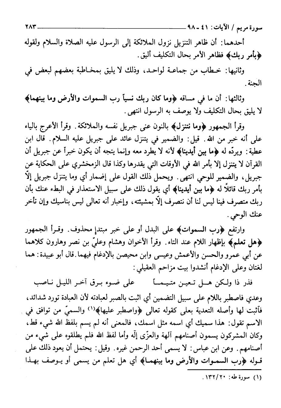 وَارْتَفَعَ رَبُّ السَّماواتِ عَلَى الْبَدَلِ أَوْ عَلَى خَبَرِ مُبْتَدَأٍ مَحْذُوفٍ. وَقَرَأَ الْجُمْهُورُ هَلْ تَعْلَمُ بِإِظْهَارِ اللَّامِ عِنْدَ التَّاءِ. وَقَرَأَ الْأَخَوَانِ وَهِشَامٌ وَعَلِيُّ بْنُ نَصْرٍ وَهَارُونُ كِلَاهُمَا عَنْ أَبِي عَمْرٍو وَالْحَسَنِ وَالْأَعْمَشِ وَعِيسَى وَابْنِ مُحَيْصِنٍ بِالْإِدْغَامِ فِيهِمَا. قَالَ أَبُو عُبَيْدَةَ: هُمَا لُغَتَانِ وَعَلَى الْإِدْغَامِ أَنْشَدُوا بَيْتَ مُزَاحِمٍ الْعُقَيْلِيِّ: