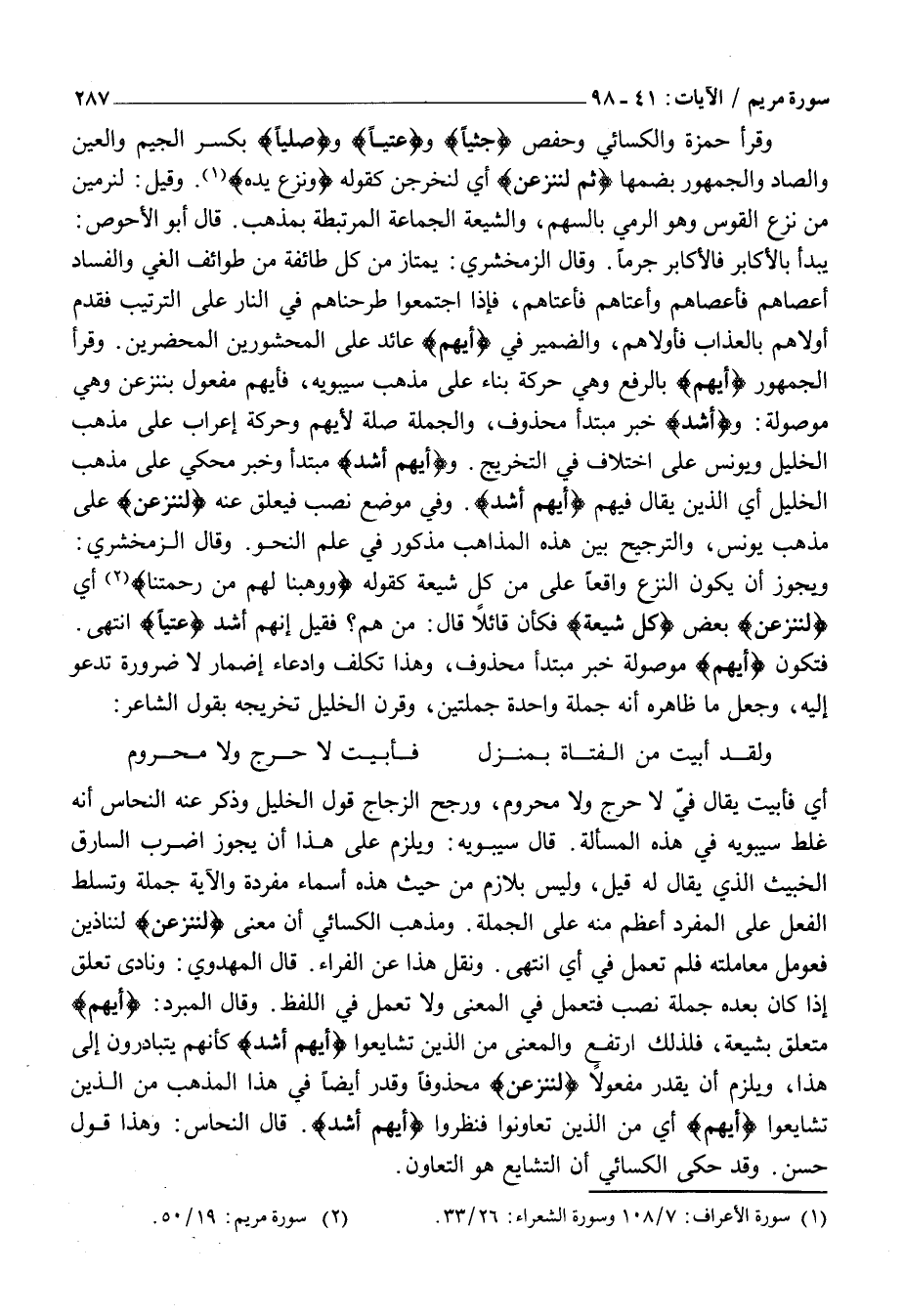 أَيْ فَأَبِيتُ يُقَالُ فِيَّ لَا حَرِجٌ وَلَا مَحْرُومٌ، وَرَجَّحَ الزَّجَّاجُ قَوْلَ الْخَلِيلِ وَذَكَرَ عَنْهُ النَّحَّاسُ أَنَّهُ غَلَّطَ سِيبَوَيْهِ فِي هَذِهِ الْمَسْأَلَةِ. قَالَ سِيبَوَيْهِ: وَيَلْزَمُ عَلَى هَذَا أَنْ يَجُوزَ اضْرِبِ السَّارِقَ الْخَبِيثَ الَّذِي يُقَالُ لَهُ قِيلَ، وَلَيْسَ بِلَازِمٍ مِنْ حَيْثُ هَذِهِ أَسْمَاءٌ مُفْرَدَةٌ وَالْآيَةُ جُمْلَةٌ وَتَسَلُّطُ الْفِعْلِ عَلَى الْمُفْرَدِ أَعْظَمُ مِنْهُ عَلَى الْجُمْلَةِ. وَمَذْهَبُ الْكِسَائِيِّ أَنَّ معنى لَنَنْزِعَنَّ لنناذين فَعُومِلَ مُعَامَلَتَهُ فَلَمْ تَعْمَلْ فِي أَيُّ انْتَهَى. وَنُقِلَ هَذَا عَنِ الْفَرَّاءِ. قَالَ الْمَهْدَوِيُّ: وَنَادَى تَعَلَّقَ إِذَا كَانَ بَعْدَهُ جُمْلَةُ نَصْبٍ فَتَعْمَلُ فِي الْمَعْنَى وَلَا تَعْمَلُ فِي اللَّفْظِ. وَقَالَ الْمُبَرِّدُ: أَيُّهُمْ مُتَعَلِّقٌ بِشِيعَةٍ، فَلِذَلِكَ ارْتَفَعَ وَالْمَعْنَى مِنَ الَّذِينَ تَشَايَعُوا أَيُّهُمْ أَشَدُّ كَأَنَّهُمْ يَتَبَادَرُونَ إِلَى هَذَا، وَيَلْزَمُ أَنْ يُقَدِّرَ مَفْعُولًا لَنَنْزِعَنَّ مَحْذُوفًا وَقَدَّرَ أَيْضًا فِي هَذَا الْمَذْهَبِ مِنَ الَّذِينَ تَشَايَعُوا أَيُّهُمْ أَيْ مِنَ الَّذِينَ تَعَاوَنُوا فَنَظَرُوا أَيُّهُمْ أَشَدُّ. قَالَ النَّحَّاسُ: وَهَذَا قَوْلٌ حَسَنٌ. وَقَدْ حَكَى الْكِسَائِيُّ أَنَّ التَّشَايُعَ هو التعاون.