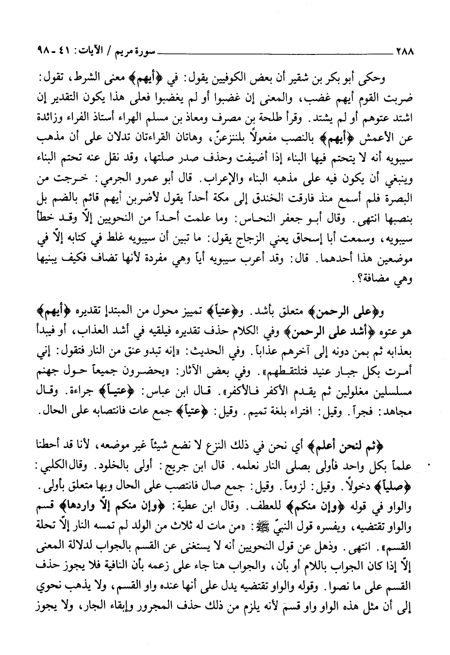 ضَرَبْتُ الْقَوْمَ أَيُّهُمْ غَضِبَ، وَالْمَعْنَى إِنْ غَضِبُوا أَوْ لَمْ يَغْضَبُوا فَعَلَى هَذَا يَكُونُ التَّقْدِيرُ إِنِ اشْتَدَّ عُتُوُّهُمْ أَوْ لَمْ يَشْتَدَّ. وَقَرَأَ طَلْحَةُ بْنُ مُصَرِّفٍ وَمُعَاذُ بْنُ مُسْلِمٍ الْهَرَّاءُ أُسْتَاذُ الْفَرَّاءِ وَزَائِدَةُ عَنِ الْأَعْمَشِ أَيُّهُمْ بالنصب مفعولا بلننزعنّ، وَهَاتَانِ الْقِرَاءَتَانِ تَدُلَّانِ عَلَى أَنَّ مَذْهَبُ سِيبَوَيْهِ أَنَّهُ لَا يَتَحَتَّمُ فِيهَا الْبِنَاءُ إِذَا أُضِيفَتْ وَحُذِفَ صَدْرُ صِلَتِهَا، وَقَدْ نُقِلَ عَنْهُ تَحَتُّمُ الْبِنَاءِ وَيَنْبَغِي أَنْ يَكُونَ فِيهِ عَلَى مَذْهَبِهِ الْبَنَّاءُ وَالْإِعْرَابُ. قَالَ أَبُو عَمْرٍو الْجَرْمِيُّ: خَرَجْتُ مِنَ الْبَصْرَةِ فَلَمْ أَسْمَعْ مُنْذُ فَارَقْتُ الْخَنْدَقَ إِلَى مَكَّةَ أَحَدًا يَقُولُ لَأَضْرِبَنَّ أَيُّهُمْ قَائِمٌ بِالضَّمِّ بَلْ بِنَصْبِهَا انْتَهَى. وَقَالَ أَبُو جَعْفَرٍ النَّحَّاسُ: وَمَا عَلِمْتُ أَحَدًا مِنَ النَّحْوِيِّينَ إِلَّا وَقَدْ خَطَّأَ سِيبَوَيْهِ، وَسَمِعْتُ أَبَا إِسْحَاقَ يَعْنِي الزَّجَّاجَ يَقُولُ: مَا تَبَيَّنَ أَنَّ سِيبَوَيْهِ غَلِطَ فِي كِتَابِهِ إِلَّا فِي مَوْضِعَيْنِ هَذَا أَحَدُهُمَا. قَالَ: وَقَدْ أَعْرَبَ سِيبَوَيْهِ أَيًّا وَهِيَ مُفْرَدَةٌ لِأَنَّهَا تُضَافُ فَكَيْفَ يَبْنِيهَا وَهِيَ مضافة؟.