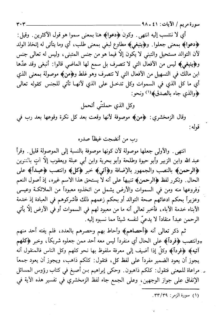 دَعَوْا بِمَعْنَى جعلوا. ويَنْبَغِي مُطَاوِعٌ لِبَغَى بِمَعْنَى طَلَبَ، أَيْ وَمَا يَتَأَتَّى لَهُ اتِّخَاذُ الْوَلَدِ لِأَنَّ التَّوَالُدَ مُسْتَحِيلٌ وَالتَّبَنِّي لَا يَكُونُ إِلَّا فِيمَا هُوَ مِنْ جِنْسِ الْمُتَبَنَّى، وَلَيْسَ لَهُ تعالى جنس ويَنْبَغِي لَيْسَ مِنَ الْأَفْعَالِ الَّتِي لَا تَتَصَرَّفُ بَلْ سُمِعَ لَهَا الْمَاضِي قَالُوا: انْبَغَى وَقَدْ عَدَّهَا ابْنُ مَالِكٍ فِي التَّسْهِيلِ مِنَ الْأَفْعَالِ الَّتِي لَا تَتَصَرَّفُ وَهُوَ غلط ومَنْ مَوْصُولَةٌ بِمَعْنَى الَّذِي أَيْ مَا كُلُّ الَّذِي فِي السموات وكل تَدْخُلُ عَلَى الَّذِي لِأَنَّهَا تَأْتِي لِلْجِنْسِ كَقَوْلِهِ تَعَالَى وَالَّذِي جاءَ بِالصِّدْقِ «1» وَنَحْوُ: