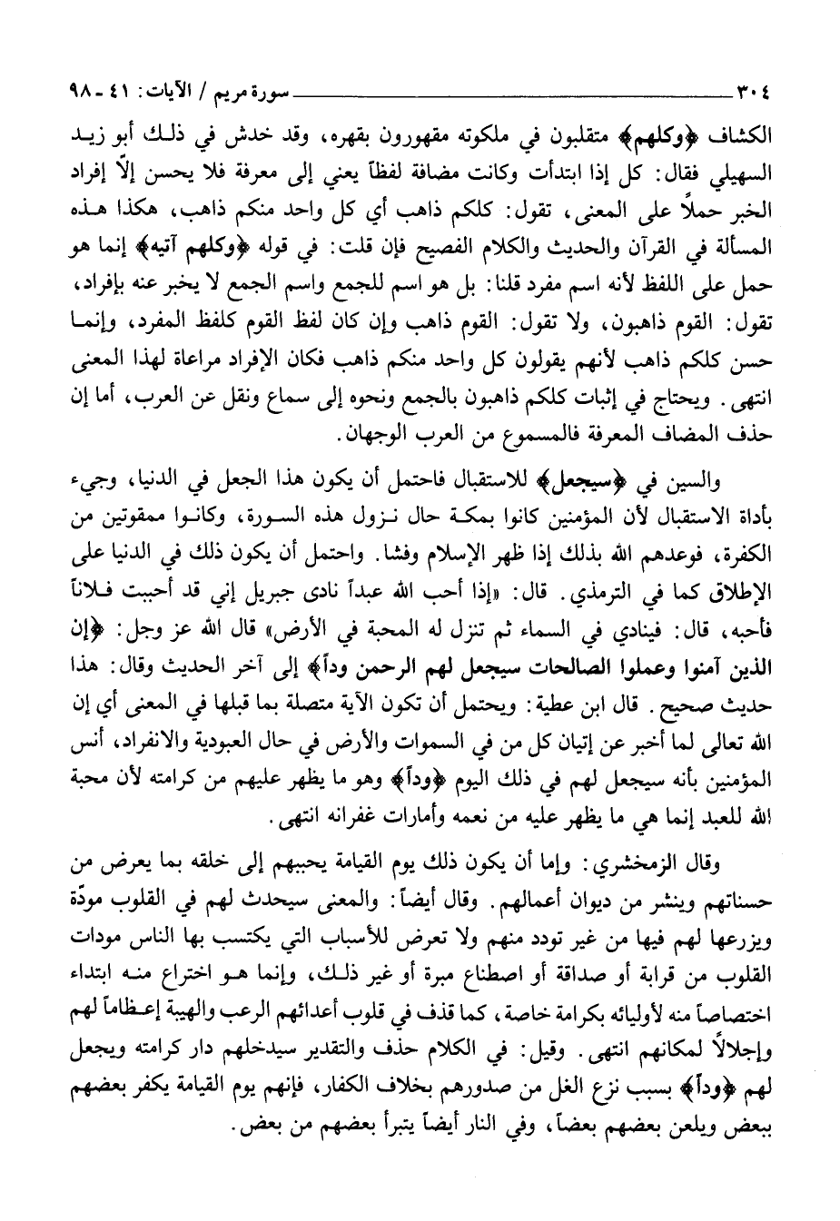 الْكَشَّافِ وَكُلُّهُمْ مُتَقَلِّبُونَ فِي مَلَكُوتِهِ مَقْهُورُونَ بِقَهْرِهِ، وَقَدْ خَدَشَ فِي ذَلِكَ أَبُو زَيْدٍ السُّهَيْلِيُّ فَقَالَ: كُلٌّ إذا ابتدأت وَكَانَتْ مُضَافَةً لَفْظًا يَعْنِي إِلَى مَعْرِفَةٍ فَلَا يَحْسُنُ إِلَّا إِفْرَادُ الْخَبَرِ حَمْلًا عَلَى الْمَعْنَى، تَقُولُ: كُلُّكُمْ ذَاهِبٌ أَيْ كُلُّ وَاحِدٍ مِنْكُمْ ذَاهِبٌ، هَكَذَا هَذِهِ الْمَسْأَلَةُ فِي الْقُرْآنِ وَالْحَدِيثِ وَالْكَلَامِ الْفَصِيحِ فَإِنْ قُلْتَ: فِي قَوْلِهِ وَكُلُّهُمْ آتِيهِ إِنَّمَا هُوَ حَمْلٌ عَلَى اللَّفْظِ لِأَنَّهُ اسْمٌ مُفْرَدٌ قُلْنَا: بَلْ هُوَ اسْمٌ لِلْجَمْعِ وَاسْمُ الْجَمْعِ لَا يُخْبَرُ عَنْهُ بِإِفْرَادٍ، تَقُولُ: الْقَوْمُ ذَاهِبُونَ، وَلَا تَقُولُ: الْقَوْمُ ذَاهِبٌ وَإِنْ كَانَ لَفْظُ الْقَوْمِ كَلَفْظِ الْمُفْرَدِ، وَإِنَّمَا حَسُنَ كُلُّكُمْ ذَاهِبٌ لِأَنَّهُمْ يَقُولُونَ كُلُّ وَاحِدٍ مِنْكُمْ ذَاهِبٌ فَكَانَ الْإِفْرَادُ مُرَاعَاةً لِهَذَا الْمَعْنَى انْتَهَى. وَيَحْتَاجُ فِي إِثْبَاتِ كُلُّكُمْ ذَاهِبُونَ بِالْجَمْعِ وَنَحْوِهِ إِلَى سَمَاعٍ وَنَقْلٍ عَنِ الْعَرَبِ، أَمَّا إِنْ حُذِفَ الْمُضَافُ الْمَعْرِفَةُ فَالْمَسْمُوعُ مِنَ الْعَرَبِ الْوَجْهَانِ.