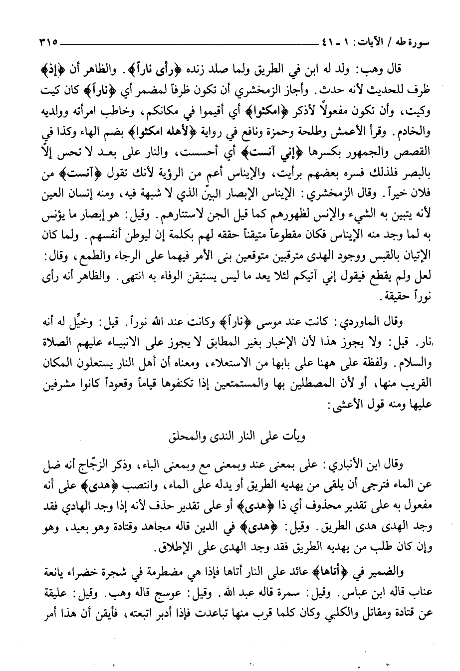 وَقَالَ الْمَاوَرْدِيُّ: كَانَتْ عِنْدَ مُوسَى نَارًا وَكَانَتْ عِنْدَ اللَّهِ نُورًا. قِيلَ: وَخُيِّلَ لَهُ أَنَّهُ نَارٌ. قِيلَ: وَلَا يَجُوزُ هَذَا لِأَنَّ الْإِخْبَارَ بِغَيْرِ الْمُطَابِقِ لَا يَجُوزُ عَلَى الْأَنْبِيَاءِ عَلَيْهِمُ الصَّلَاةُ وَالسَّلَامُ. وَلَفْظَةُ عَلَى هَاهُنَا عَلَى بَابِهَا مِنَ الِاسْتِعْلَاءِ، وَمَعْنَاهُ أَنَّ أَهْلَ النَّارِ يَسْتَعْلُونَ الْمَكَانَ الْقَرِيبَ مِنْهَا، أَوْ لِأَنَّ الْمُصْطَلِينَ بِهَا وَالْمُسْتَمْتِعِينَ إِذَا تَكَنَّفُوهَا قِيَامًا وَقُعُودًا كَانُوا مُشْرِفِينَ عَلَيْهَا ومنه قول الأعشى: