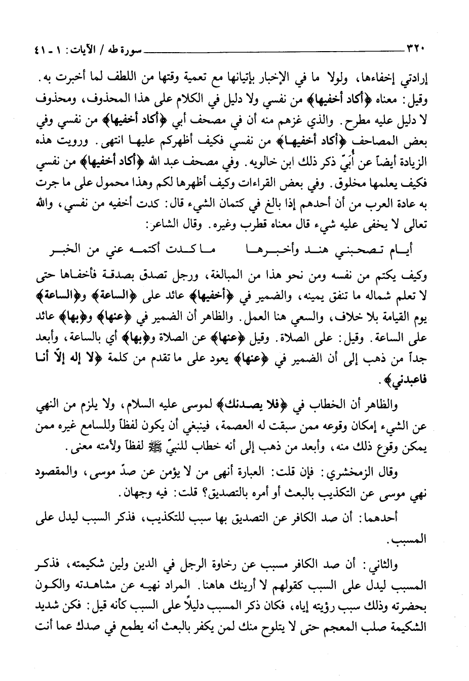 وَكَيْفَ يَكْتُمُ مِنْ نَفْسِهِ وَمِنْ نَحْوِ هَذَا مِنَ الْمُبَالَغَةِ، وَرَجُلٌ تَصَدَّقَ بِصَدَقَةٍ فَأَخْفَاهَا حَتَّى لَا تَعْلَمَ شِمَالَهُ ما تُنْفِقُ يَمِينُهُ، وَالضَّمِيرُ فِي أُخْفِيها عَائِدٌ عَلَى السَّاعَةَ والسَّاعَةَ يَوْمُ الْقِيَامَةِ بِلَا خِلَافٍ، وَالسَّعْيُ هُنَا الْعَمَلُ. وَالظَّاهِرُ أَنَّ الضَّمِيرَ فِي عَنْها وبِها عَائِدٌ عَلَى السَّاعَةِ. وَقِيلَ: عَلَى الصَّلَاةِ. وَقِيلَ عَنْها عن الصلاة وبِها أَيْ بِالسَّاعَةِ، وَأَبْعَدَ جِدًّا مَنْ ذَهَبَ إِلَى أَنَّ الضَّمِيرَ فِي عَنْها يَعُودُ عَلَى مَا تَقَدَّمَ مِنْ كلمة لَا إِلهَ إِلَّا أَنَا فَاعْبُدْنِي.
