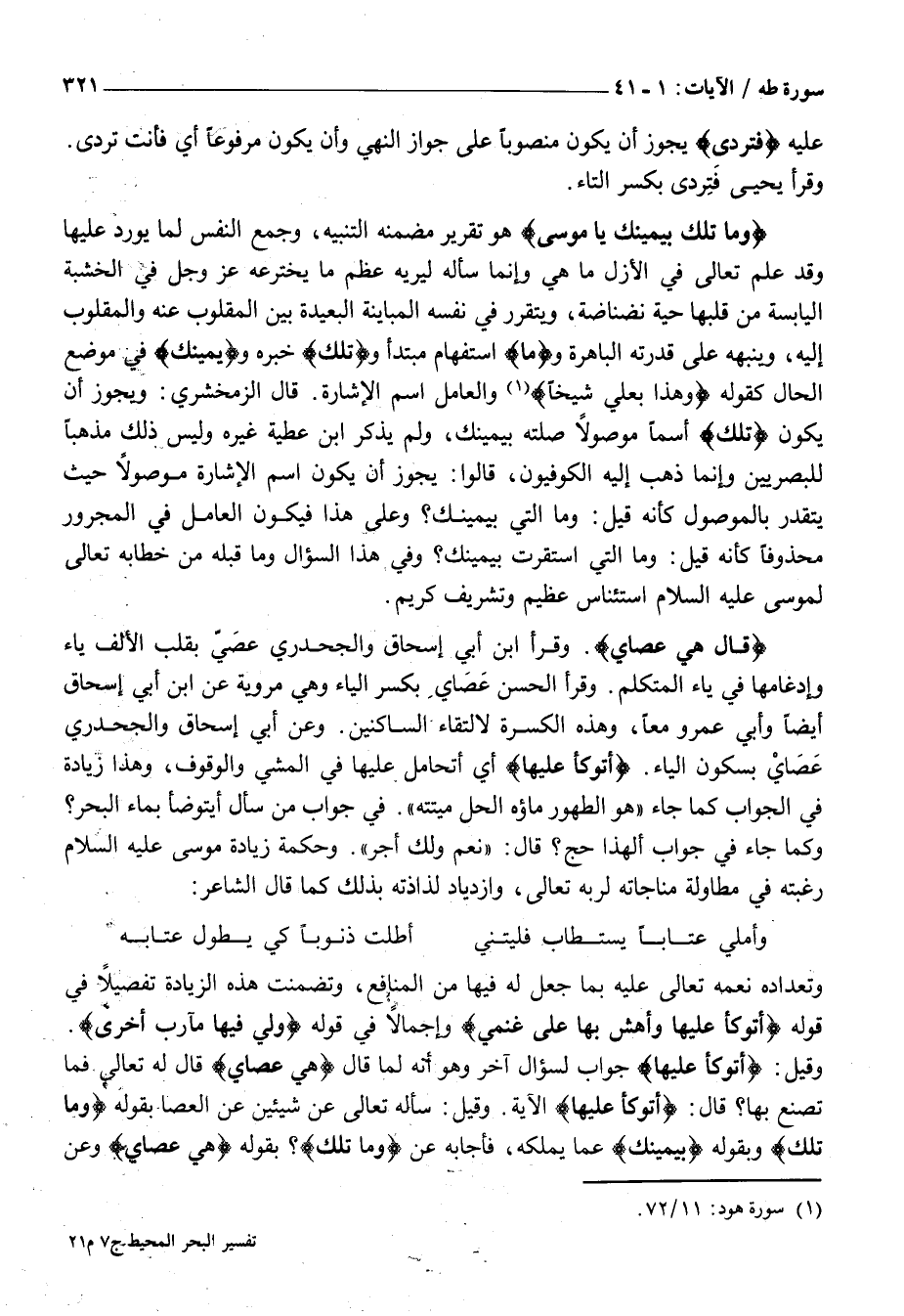 قالَ هِيَ عَصايَ. وَقَرَأَ ابْنُ أَبِي إِسْحَاقَ وَالْجَحْدَرِيُّ عَصَيَّ بِقَلْبِ الْأَلِفِ يَاءً وَإِدْغَامِهَا فِي يَاءِ الْمُتَكَلِّمِ. وَقَرَأَ الْحَسَنُ عَصَايِ بِكَسْرِ الياء وهي مروية عن ابْنِ أَبِي إِسْحَاقَ أَيْضًا وَأَبِي عَمْرٍو مَعًا، وَهَذِهِ الْكَسْرَةُ لِالْتِقَاءِ السَّاكِنَيْنِ. وَعَنْ أَبِي إِسْحَاقَ وَالْجَحْدَرِيِّ عَصَايْ بسكون الياء. أَتَوَكَّؤُا عَلَيْها أَيْ أَتَحَامَلُ عَلَيْهَا فِي الْمَشْيِ وَالْوُقُوفِ، وَهَذَا زِيَادَةٌ فِي الْجَوَابِ كَمَا