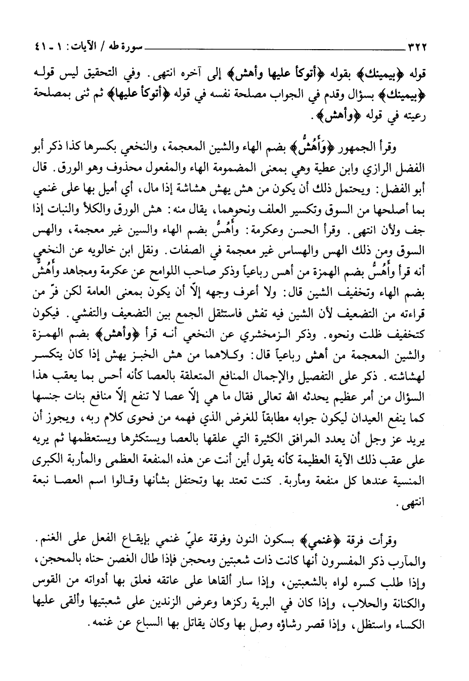 وَقَرَأَ الْجُمْهُورُ وَأَهُشُّ بِضَمِّ الْهَاءِ وَالشِّينِ الْمُعْجَمَةِ، وَالنَّخَعِيُّ بِكَسْرِهَا كَذَا ذَكَرَ أَبُو الْفَضْلِ الرَّازِيُّ وَابْنُ عَطِيَّةَ وَهِيَ بِمَعْنَى الْمَضْمُومَةِ الْهَاءِ وَالْمَفْعُولُ مَحْذُوفٌ وَهُوَ الْوَرِقُ. قَالَ أَبُو الْفَضْلِ: وَيَحْتَمِلُ ذَلِكَ أَنْ يَكُونَ مِنْ هَشَّ يَهُشُّ هَشَاشَةً إِذَا مَالَ، أَيْ أَمِيلُ بِهَا عَلَى غَنَمِي بِمَا أُصْلِحُهَا مِنَ السَّوْقِ وَتَكْسِيرِ الْعَلَفِ وَنَحْوِهِمَا، يُقَالُ مِنْهُ: هَشَّ الْوَرَقُ وَالْكَلَأُ وَالنَّبَاتُ إِذَا جَفَّ وَلَانَ انْتَهَى. وَقَرَأَ الْحَسَنُ وَعِكْرِمَةُ: وَأَهُسُّ بِضَمِّ الْهَاءِ وَالسِّينِ غَيْرَ مُعْجَمَةٍ، وَالْهَسُّ السَّوْقُ وَمِنْ ذَلِكَ الْهَسُّ وَالْهَسَّاسُ غَيْرَ مُعْجَمَةٍ فِي الصِّفَاتِ. وَنَقَلَ ابْنُ خَالَوَيْهِ عَنِ النَّخَعِيِّ أَنَّهُ قَرَأَ وَأَهُسُّ بِضَمِّ الْهَمْزَةِ مِنْ أَهَسَّ رُبَاعِيًّا وَذَكَرَ صَاحِبُ اللَّوَامِحِ عَنْ عِكْرِمَةَ وَمُجَاهِدٍ وَأَهُشُّ بِضَمِّ الْهَاءِ وَتَخْفِيفِ الشِّينِ قَالَ: وَلَا أَعْرِفُ وَجْهَهُ إِلَّا أَنْ يَكُونَ بِمَعْنَى الْعَامَّةِ لَكِنْ فَرَّ مِنْ قِرَاءَتِهِ مِنَ التَّضْعِيفِ لِأَنَّ الشِّينَ فِيهِ تَفَشٍّ فَاسْتَثْقَلَ الْجَمْعَ بَيْنَ التَّضْعِيفِ وَالتَّفَشِّي. فَيَكُونُ كَتَخْفِيفِ ظَلْتَ وَنَحْوِهِ. وَذَكَرَ الزَّمَخْشَرِيُّ عَنِ النَّخَعِيِّ أَنَّهُ قَرَأَ وَأَهُشُّ بِضَمِّ الْهَمْزَةِ وَالشِّينِ الْمُعْجَمَةِ مِنْ أَهَشَّ رُبَاعِيًّا قَالَ: وَكِلَاهُمَا مِنْ هَشَّ الْخُبْزُ يَهِشُّ إِذَا كَانَ يَتَكَسَّرُ لِهَشَاشَتِهِ. ذَكَرَ عَلَى التَّفْصِيلِ وَالْإِجْمَالِ الْمَنَافِعَ الْمُتَعَلِّقَةَ بِالْعَصَا كَأَنَّهُ أَحَسَّ بِمَا يَعْقُبُ هَذَا السُّؤَالَ مِنْ أَمْرٍ عَظِيمٍ يُحْدِثُهُ اللَّهُ تَعَالَى فَقَالَ مَا هِيَ إِلَّا عَصًا لَا تَنْفَعُ إِلَّا مَنَافِعَ بَنَاتِ جِنْسِهَا كَمَا يَنْفَعُ الْعِيدَانُ لِيَكُونَ جَوَابُهُ مُطَابِقًا لِلْغَرَضِ الَّذِي فَهِمَهُ مِنْ فَحْوَى كَلَامِ رَبِّهِ، وَيَجُوزُ أَنْ يُرِيدَ عَزَّ وَجَلَّ أَنْ يُعَدِّدَ الْمَرَافِقَ الْكَثِيرَةَ الَّتِي عَلَّقَهَا بِالْعَصَا وَيَسْتَكْثِرُهَا وَيَسْتَعْظِمُهَا ثُمَّ يُرِيَهُ عَلَى عَقِبِ ذَلِكَ الْآيَةِ الْعَظِيمَةِ كَأَنَّهُ يَقُولُ أَيْنَ أَنْتَ عَنْ هَذِهِ الْمَنْفَعَةِ الْعُظْمَى وَالْمَأْرَبَةِ الْكُبْرَى الْمَنْسِيَّةُ عِنْدَهَا كُلُّ مَنْفَعَةٍ وَمَأْرَبَةٍ. كُنْتَ تَعْتَدُّ بِهَا وَتَحْتَفِلُ بِشَأْنِهَا وَقَالُوا اسْمُ الْعَصَا نَبْعَةٌ انْتَهَى.