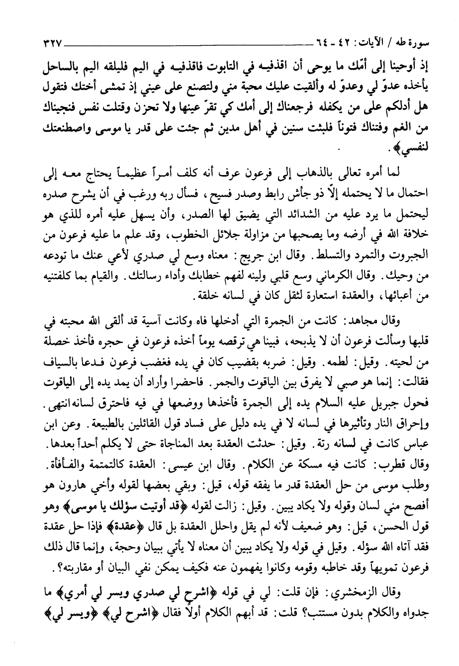 وَطَلَبُ مُوسَى مِنْ حَلِّ الْعُقْدَةِ قَدْرَ مَا يُفْقَهُ قَوْلُهُ، قِيلَ: وَبَقِيَ بَعْضُهَا لِقَوْلِهِ وَأَخِي هَارُونُ هُوَ أَفْصَحُ مني لسان وَقَوْلِهِ وَلَا يَكَادُ يُبِينُ. وَقِيلَ: زَالَتْ لِقَوْلِهِ قَدْ أُوتِيتَ سُؤْلَكَ يَا مُوسى وَهُوَ قَوْلُ الْحَسَنِ، قِيلَ: وَهُوَ ضَعِيفٌ لِأَنَّهُ لَمْ يَقُلْ وَاحْلُلِ الْعُقْدَةَ بَلْ قَالَ عُقْدَةً فَإِذَا حَلَّ عُقْدَةً فَقَدْ آتَاهُ اللَّهُ سُؤْلَهُ. وَقِيلَ فِي قَوْلِهِ وَلَا يَكَادُ يُبِينُ أَنَّ مَعْنَاهُ لَا يَأْتِي بِبَيَانٍ وَحُجَّةٍ، وَإِنَّمَا قَالَ ذَلِكَ فِرْعَوْنُ تَمْوِيهًا وَقَدْ خَاطَبَهُ وَقَوْمَهُ وَكَانُوا يَفْهَمُونَ عَنْهُ فَكَيْفَ يُمْكِنُ نَفْيُ الْبَيَانِ أَوْ مُقَارَبَتُهُ؟.
