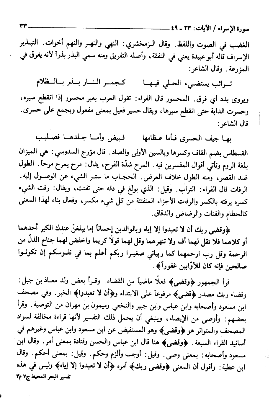 وَقَضَاءُ رَبِّكَ مَصْدَرُ قَضى مَرْفُوعًا عَلَى الِابْتِدَاءِ وأَلَّا تَعْبُدُوا الْخَبَرُ. وَفِي مُصْحَفِ ابْنِ مَسْعُودٍ وَأَصْحَابِهِ وَابْنُ عَبَّاسٍ وَابْنُ جُبَيْرٍ وَالنَّخَعِيِّ وَمَيْمُونِ بْنِ مِهْرَانَ مِنَ التَّوْصِيَةِ. وَقَرَأَ بَعْضُهُمْ: وَأَوْصَى مِنَ الْإِيصَاءِ، وَيَنْبَغِي أَنْ يُحْمَلَ ذَلِكَ التَّفْسِيرُ لِأَنَّهَا قِرَاءَةٌ مُخَالِفَةٌ لِسَوَادِ الْمُصْحَفِ وَالْمُتَوَاتِرُ هُوَ وَقَضى وَهُوَ الْمُسْتَفِيضُ عَنِ ابْنِ مَسْعُودٍ وَابْنِ عَبَّاسٍ وَغَيْرِهِمْ فِي أَسَانِيدِ الْقُرَّاءِ السَّبْعَةِ. وَقَضى هُنَا قَالَ ابْنُ عَبَّاسٍ وَالْحَسَنُ وَقَتَادَةُ بِمَعْنَى أَمَرَ. وَقَالَ ابْنُ مَسْعُودٍ وَأَصْحَابُهُ: بِمَعْنَى وَصَّى. وَقِيلَ: أَوْجَبَ وَأَلْزَمَ وَحَكَمَ. وَقِيلَ: بِمَعْنَى أَحْكَمَ. وَقَالَ ابْنُ عَطِيَّةَ: وَأَقُولُ إِنَّ الْمَعْنَى وَقَضى رَبُّكَ أمره أَلَّا تَعْبُدُوا إِلَّا إِيَّاهُ وَلَيْسَ فِي هَذِهِ