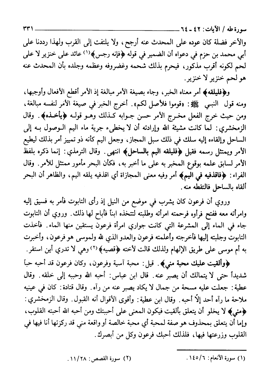 وَأَلْقَيْتُ عَلَيْكَ مَحَبَّةً مِنِّي. قِيلَ: مَحَبَّةَ آسِيَةَ وَفِرْعَوْنَ، وَكَانَ فِرْعَوْنُ قَدْ أَحَبَّهُ حُبًّا شَدِيدًا حَتَّى لَا يَتَمَالَكَ أَنْ يَصْبِرَ عَنْهُ.