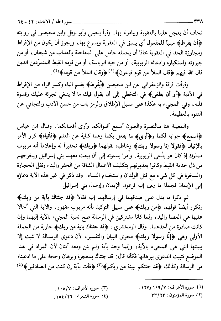 وَالْمَعِيَّةُ هُنَا بِالنُّصْرَةِ وَالْعَوْنِ أَسْمَعُ أَقْوَالَكُمَا وَأَرَى أَفْعَالَكُمَا. وَقَالَ ابْنُ عَبَّاسٍ أَسْمَعُ جَوَابَهُ لَكُمَا وأَرى مَا يَفْعَلُ بِكُمَا وَهُمَا كِنَايَةٌ عَنِ الْعِلْمِ فَأْتِياهُ كَرَّرَ الْأَمْرَ بِالْإِتْيَانِ فَقُولا إِنَّا رَسُولا رَبِّكَ وَخَاطَبَاهُ بِقَوْلِهِمَا رَبِّكَ تَحْقِيرًا لَهُ وَإِعْلَامًا أَنَّهُ مَرْبُوبٌ مَمْلُوكٌ إِذْ كَانَ هُوَ يَدَّعِي الرُّبُوبِيَّةَ. وَأُمِرَا بِدَعْوَتِهِ إِلَى أَنْ يَبْعَثَ مَعَهُمَا بَنِي إِسْرَائِيلَ وَيُخْرِجَهُمْ مِنْ ذُلِّ خِدْمَةِ الْقِبْطِ وَكَانُوا يُعَذِّبُونَهُمْ بِتَكْلِيفِ الْأَعْمَالِ الشَّاقَّةِ مِنَ الْحَفْرِ وَالْبِنَاءِ وَنَقْلِ الْحِجَارَةِ وَالسُّخْرَةِ فِي كُلِّ شَيْءٍ مَعَ قَتْلِ الْوِلْدَانِ وَاسْتِخْدَامِ النِّسَاءِ. وَقَدْ ذُكِرَ فِي غَيْرِ هَذِهِ الْآيَةِ دُعَاؤُهُ إِلَى الْإِيمَانِ فَجُمْلَةُ ما دعا إِلَيْهِ فِرْعَوْنُ الْإِيمَانُ وَإِرْسَالُ بَنِي إِسْرَائِيلَ.