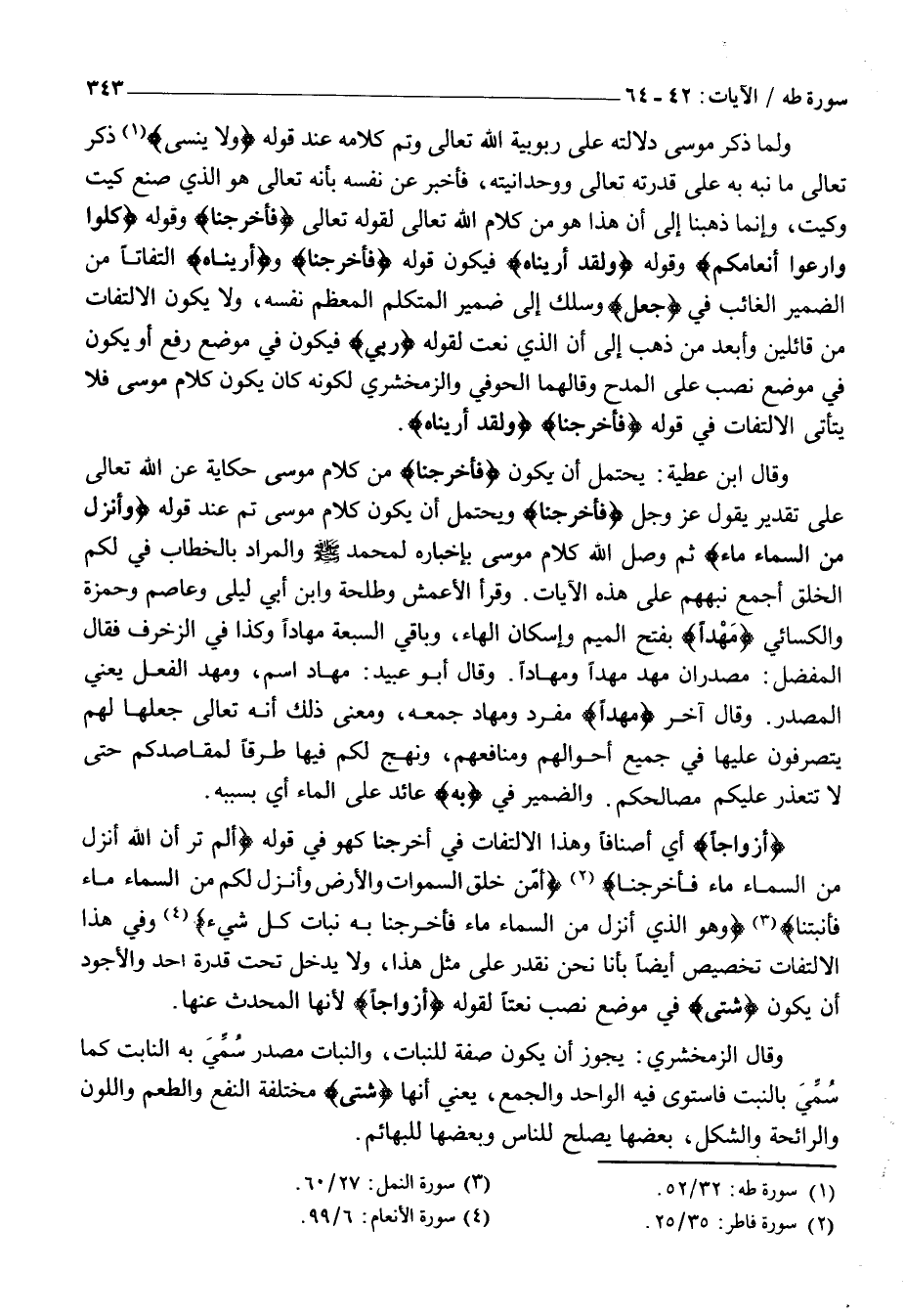 وَقَالَ ابْنُ عَطِيَّةَ: يُحْتَمَلُ أَنْ يَكُونَ فَأَخْرَجْنا مِنْ كَلَامِ مُوسَى حِكَايَةً عَنِ اللَّهِ تَعَالَى عَلَى تَقْدِيرِ يَقُولُ عَزَّ وَجَلَّ فَأَخْرَجْنا وَيَحْتَمِلُ أَنْ يَكُونَ كَلَامُ مُوسَى تَمَّ عِنْدَ قَوْلِهِ وَأَنْزَلَ مِنَ السَّماءِ مَاءً ثُمَّ وَصَلَ اللَّهُ كَلَامَ مُوسَى بِإِخْبَارِهِ لِمُحَمَّدٍ صَلَّى اللَّهُ عَلَيْهِ وَسَلَّمَ وَالْمُرَادُ بِالْخِطَابِ فِي لَكُمُ الْخَلْقُ أَجْمَعُ نَبَّهَهُمْ عَلَى هَذِهِ الْآيَاتِ. وَقَرَأَ الْأَعْمَشُ وَطَلْحَةُ وَابْنُ أَبِي لَيْلَى وَعَاصِمٌ وَحَمْزَةُ وَالْكِسَائِيُّ مَهْداً بِفَتْحِ الْمِيمِ وَإِسْكَانِ الْهَاءِ، وَبَاقِي السَّبْعَةِ مِهَادًا وَكَذَا فِي الزُّخْرُفِ فَقَالَ الْمُفَضَّلُ: مَصْدَرَانِ مَهَّدَ مَهْدًا وَمِهَادًا. وَقَالَ أَبُو عُبَيْدٍ: مِهَادٌ اسْمٌ، وَمَهْدٌ الْفِعْلُ يَعْنِي الْمَصْدَرَ. وَقَالَ آخَرُ مَهْداً مُفْرَدٌ وَمِهَادٌ جَمْعُهُ، وَمَعْنَى ذَلِكَ أَنَّهُ تَعَالَى جَعَلَهَا لَهُمْ يَتَصَرَّفُونَ عَلَيْهَا فِي جَمِيعِ أَحْوَالِهِمْ وَمَنَافِعِهِمْ، وَنَهَجَ لَكُمْ فِيهَا طُرُقًا لِمَقَاصِدِكُمْ حَتَّى لَا تَتَعَذَّرَ عَلَيْكُمْ مَصَالِحُكُمْ. وَالضَّمِيرُ فِي بِهِ عَائِدٌ عَلَى الْمَاءِ أَيْ بِسَبَبِهِ.
