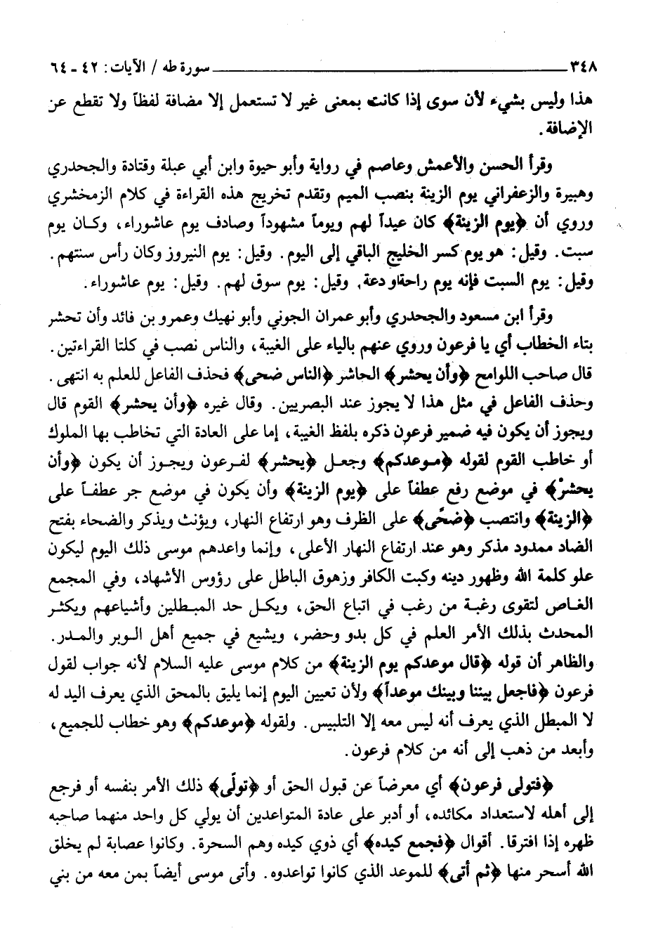 وَحَذْفُ الْفَاعِلِ فِي مِثْلِ هَذَا لَا يَجُوزُ عِنْدَ الْبَصْرِيِّينَ. وَقَالَ غَيْرُهُ وَأَنْ يُحْشَرَ الْقَوْمُ قَالَ وَيَجُوزُ أَنْ يَكُونَ فِيهِ ضَمِيرُ فِرْعَوْنَ ذَكَرَهُ بِلَفْظِ الْغَيْبَةِ، إِمَّا عَلَى الْعَادَةِ الَّتِي تُخَاطَبُ بِهَا الْمُلُوكُ أَوْ خَاطَبَ الْقَوْمَ لِقَوْلِهِ مَوْعِدُكُمْ وَجَعَلَ يُحْشَرَ لِفِرْعَوْنَ وَيَجُوزُ أَنْ يَكُونَ وَأَنْ يُحْشَرَ فِي مَوْضِعِ رَفْعٍ عَطْفًا عَلَى يَوْمُ الزِّينَةِ وَأَنْ يَكُونَ فِي مَوْضِعِ جَرٍّ عَطْفًا عَلَى الزِّينَةِ وَانْتَصَبَ ضُحًى عَلَى الظَّرْفِ وَهُوَ ارْتِفَاعُ النَّهَارِ، وَيُؤَنَّثُ وَيُذَكَّرُ وَالضَّحَاءُ بِفَتْحِ الضَّادِ مَمْدُودٌ مُذَكَّرُ وَهُوَ عِنْدَ ارْتِفَاعِ النَّهَارِ الْأَعْلَى، وَإِنَّمَا وَاعَدَهُمْ مُوسَى ذَلِكَ الْيَوْمَ لِيَكُونَ عُلُوُّ كَلِمَةِ اللَّهِ وَظُهُورُ دِينِهِ وَكَبْتُ الْكَافِرِ وزهوق الباطل على رؤوس الْأَشْهَادِ، وَفِي الْمَجْمَعِ الْغَاصِّ لِتَقْوَى رَغْبَةُ مَنْ رَغِبَ فِي اتِّبَاعِ الْحَقِّ، وَيَكِلَّ حَدُّ الْمُبْطِلِينَ وَأَشْيَاعِهِمْ وَيَكْثُرُ الْمُحَدِّثُ بِذَلِكَ الْأَمْرِ الْعَلَمِ فِي كُلِّ بَدْوٍ وَحَضَرٍ، وَيَشِيعُ فِي جَمِيعِ أَهْلِ الْوَبَرِ وَالْمَدَرِ.