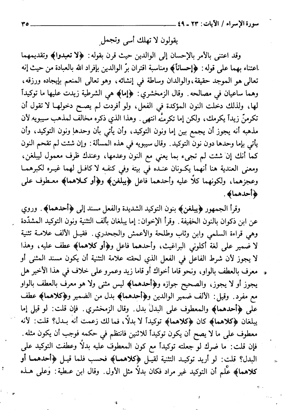 يَقُولُونَ لَا تَهْلِكْ أَسًى وَتَجَمَّلِ وَقَدِ اعْتَنَى بِالْأَمْرِ بِالْإِحْسَانِ إِلَى الْوَالِدَيْنِ حَيْثُ قُرِنَ بِقَوْلِهِ: لَا تَعْبُدُوا وَتَقْدِيمُهُمَا اعْتِنَاءٌ بِهِمَا عَلَى قَوْلِهِ: إِحْساناً وَمُنَاسَبَةُ اقْتِرَانِ بِرِّ الْوَالِدَيْنِ بِإِفْرَادِ اللَّهِ بِالْعِبَادَةِ مِنْ حَيْثُ إِنَّهُ تَعَالَى هُوَ الْمُوجِدُ حَقِيقَةً، وَالْوَالِدَانِ وَسَاطَةٌ فِي إِنْشَائِهِ، وَهُوَ تَعَالَى الْمُنْعِمُ بِإِيجَادِهِ وَرِزْقِهِ، وَهُمَا سَاعِيَانِ فِي مَصَالِحِهِ. وَقَالَ الزَّمَخْشَرِيُّ: إِمَّا هِيَ الشَّرْطِيَّةُ زِيدَتْ عَلَيْهَا مَا تَوْكِيدًا لَهَا، وَلِذَلِكَ دَخَلَتِ النُّونُ الْمُؤَكِّدَةُ فِي الْفِعْلِ، وَلَوْ أُفْرِدَتْ لَمْ يَصِحَّ دُخُولُهَا لَا تَقُولُ إِنْ تُكْرِمَنَّ زَيْدًا يُكْرِمْكَ، وَلَكِنْ إِمَّا تُكْرِمَنَّهُ انْتَهَى. وَهَذَا الَّذِي ذَكَرَهُ مُخَالِفٌ لِمَذْهَبِ سِيبَوَيْهِ لِأَنَّ مَذْهَبَهُ أَنَّهُ يَجُوزُ أَنْ يُجْمَعَ بَيْنَ إِمَّا وَنُونِ التَّوْكِيدِ، وَأَنْ يَأْتِيَ بِأَنْ وَحْدَهَا وَنُونِ التَّوْكِيدِ، وَأَنْ يَأْتِيَ بِإِمَّا وَحْدَهَا دُونَ نُونِ التَّوْكِيدِ. وَقَالَ سِيبَوَيْهِ فِي هَذِهِ الْمَسْأَلَةِ: وَإِنْ شِئْتَ لَمْ تُقْحِمِ النُّونَ كَمَا أَنَّكَ إِنْ شِئْتَ لَمْ تجىء بِمَا يُعْنَى مَعَ النُّونِ وَعَدَمِهَا، وَعِنْدَكَ ظَرْفٌ مَعْمُولٌ لِيَبْلُغَنَّ، وَمَعْنَى الْعِنْدِيَّةِ هُنَا أَنَّهُمَا يَكُونَانِ عِنْدَهُ فِي بَيْتِهِ وَفِي كَنَفِهِ لَا كَافِلَ لَهُمَا غَيْرُهُ لِكِبَرِهِمَا وَعَجْزِهِمَا، وَلِكَوْنِهِمَا كَلًّا عَلَيْهِ وأحدهما فاعل يَبْلُغَنَّ وأَوْ كِلاهُما مَعْطُوفٌ عَلَى أَحَدُهُما.