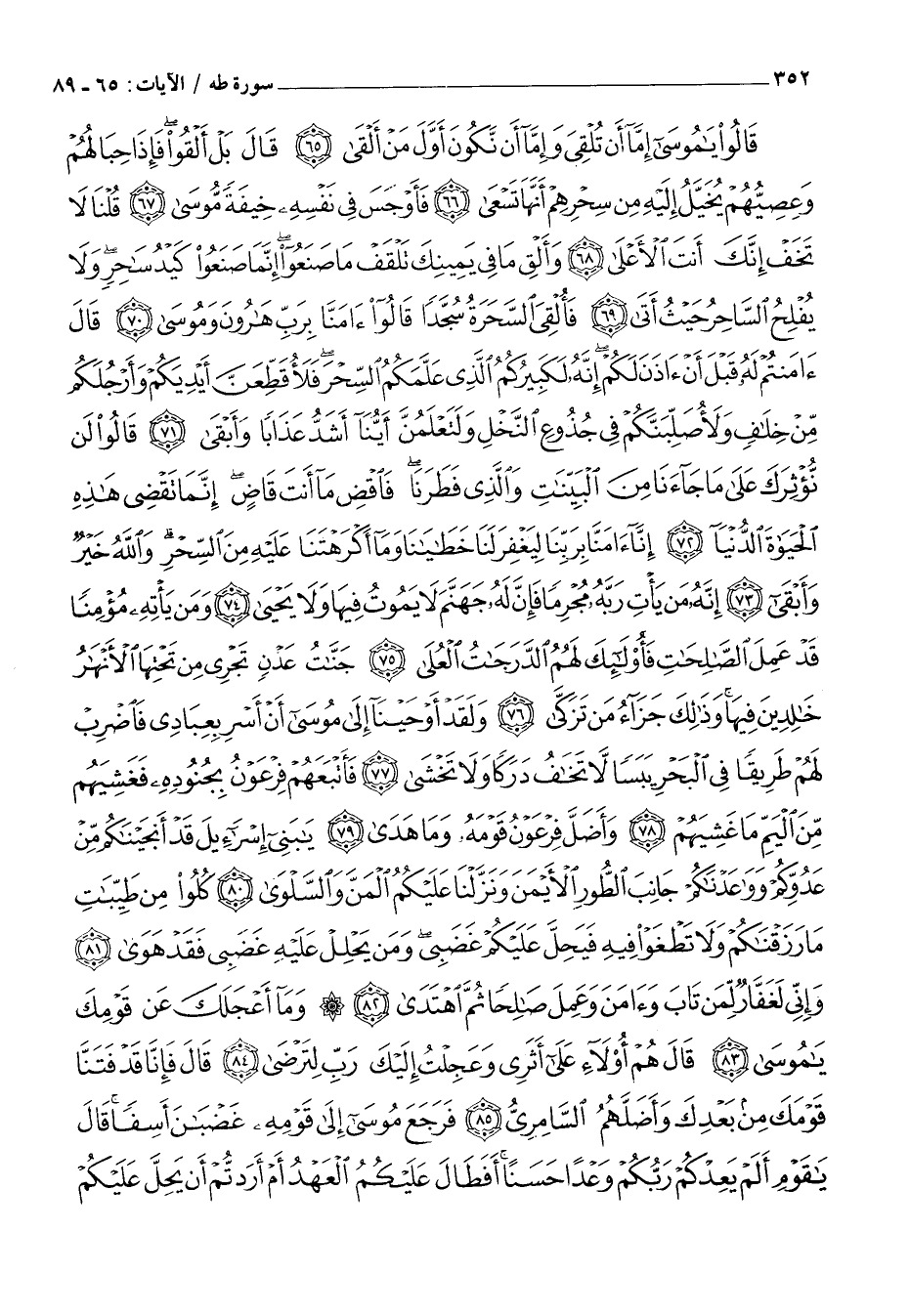 قالُوا يَا مُوسى إِمَّا أَنْ تُلْقِيَ وَإِمَّا أَنْ نَكُونَ أَوَّلَ مَنْ أَلْقى (65) قالَ بَلْ أَلْقُوا فَإِذا حِبالُهُمْ وَعِصِيُّهُمْ يُخَيَّلُ إِلَيْهِ مِنْ سِحْرِهِمْ أَنَّها تَسْعى (66) فَأَوْجَسَ فِي نَفْسِهِ خِيفَةً مُوسى (67) قُلْنا لَا تَخَفْ إِنَّكَ أَنْتَ الْأَعْلى (68) وَأَلْقِ مَا فِي يَمِينِكَ تَلْقَفْ مَا صَنَعُوا إِنَّما صَنَعُوا كَيْدُ ساحِرٍ وَلا يُفْلِحُ السَّاحِرُ حَيْثُ أَتى (69)