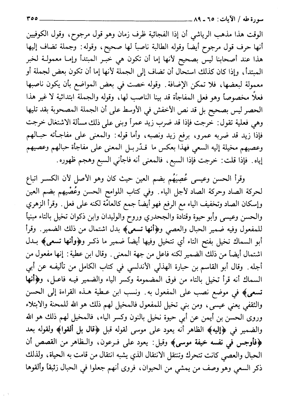 وَقَرَأَ الْحَسَنُ وَعِيسَى عُصِيَّهُمْ بِضَمِّ الْعَيْنِ حَيْثُ كَانَ وَهُوَ الْأَصْلُ لِأَنَّ الْكَسْرَ إِتْبَاعٌ لِحَرَكَةِ الصَّادِ وَحَرَكَةُ الصَّادِ لِأَجْلِ الْيَاءِ. وَفِي كِتَابِ اللَّوَامِحِ الْحَسَنُ وَعُصْيُهُمْ بِضَمِّ الْعَيْنِ وَإِسْكَانِ الصَّادِ وَتَخْفِيفِ الْيَاءِ مَعَ الرَّفْعِ فَهُوَ أَيْضًا جَمْعٌ كَالْعَامَّةِ لَكِنَّهُ عَلَى فُعْلٍ. وَقَرَأَ الزُّهْرِيُّ وَالْحَسَنُ وَعِيسَى وَأَبُو حَيْوَةَ وَقَتَادَةُ وَالْجَحْدَرِيُّ وَرَوْحٌ وَالْوَلِيدَانِ وَابْنُ ذَكْوَانَ تُخَيَّلُ بِالتَّاءِ مَبْنِيًّا لِلْمَفْعُولِ وَفِيهِ ضَمِيرُ الحبال والعصي وأَنَّها تَسْعى بَدَلُ اشْتِمَالٍ مِنْ ذَلِكَ الضَّمِيرِ. وَقَرَأَ أَبُو السَّمَّاكِ تَخَيَّلُ بِفَتْحِ التَّاءِ أَيْ تَتَخَيَّلُ وَفِيهَا أَيْضًا ضمير ما ذكر وأَنَّها تَسْعى بَدَلُ اشْتِمَالٍ أَيْضًا مِنْ ذَلِكَ الضَّمِيرِ لَكِنَّهُ فَاعِلٌ مِنْ جِهَةِ الْمَعْنَى. وَقَالَ ابْنُ عَطِيَّةَ: أَنَّهَا مَفْعُولٌ مِنْ أَجْلِهِ. وَقَالَ أَبُو الْقَاسِمِ بْنُ حُبَارَةَ الْهُذَلِيُّ الْأَنْدَلُسِيُّ فِي كِتَابِ الْكَامِلِ مِنْ تَأْلِيفِهِ عَنْ أَبِي السَّمَّاكِ أَنَّهُ قَرَأَ تُخَيَّلُ بِالتَّاءِ مِنْ فَوْقُ الْمَضْمُومَةِ وَكَسْرِ الْيَاءِ وَالضَّمِيرُ فيه فاعل، وأَنَّها تَسْعى فِي مَوْضِعِ نَصْبٍ عَلَى الْمَفْعُولِ بِهِ. وَنَسَبَ ابْنُ عَطِيَّةَ هَذِهِ الْقِرَاءَةَ إِلَى الْحَسَنِ وَالثَّقَفِيِّ يَعْنِي عِيسَى، وَمَنْ بَنَى تُخَيَّلُ لِلْمَفْعُولِ فَالْمُخَيِّلُ لَهُمْ ذَلِكَ هُوَ اللَّهُ لِلْمِحْنَةِ وَالِابْتِلَاءِ وَرَوَى الْحَسَنُ بْنُ أَيْمَنَ عَنْ أَبِي حَيْوَةَ نُخَيِّلُ بِالنُّونِ وَكَسْرِ الْيَاءِ، فَالْمُخَيِّلُ لَهُمْ ذَلِكَ هُوَ اللَّهُ وَالضَّمِيرُ فِي إِلَيْهِ الظَّاهِرُ أَنَّهُ يَعُودُ عَلَى مُوسَى لِقَوْلِهِ قَبْلُ قالَ بَلْ أَلْقُوا وَلِقَوْلِهِ بَعْدُ فَأَوْجَسَ فِي نَفْسِهِ خِيفَةً مُوسى وَقِيلَ: يَعُودُ عَلَى فِرْعَوْنَ، وَالظَّاهِرُ مِنَ الْقَصَصِ أَنَّ الْحِبَالَ وَالْعِصِيَّ كَانَتْ تَتَحَرَّكُ وَتَنْتَقِلُ الِانْتِقَالَ الَّذِي يُشْبِهُ انْتِقَالَ مَنْ قَامَتْ بِهِ الْحَيَاةُ، وَلِذَلِكَ ذَكَرَ السَّعْيَ وَهُوَ وَصْفُ مَنْ يَمْشِي مِنَ الْحَيَوَانِ، فَرُوِيَ أَنَّهُمْ جعلوا في الحبال زِئْبَقًا وَأَلْقَوْهَا