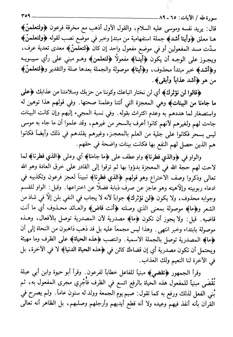 وَالْوَاوُ فِي وَالَّذِي فَطَرَنا وَاوُ عَطْفٍ عَلَى مَا جاءَنا أَيْ وعلى الَّذِي فَطَرَنا لَمَّا لَاحَتْ لَهُمْ حُجَّةُ اللَّهِ فِي الْمُعْجِزَةِ بدؤوا بِهَا ثُمَّ تَرَقَّوْا إِلَى الْقَادِرِ عَلَى خَرْقِ الْعَادَةِ وَهُوَ اللَّهُ تَعَالَى وَذَكَرُوا وَصْفَ الِاخْتِرَاعِ وَهُوَ قَوْلُهُمْ الَّذِي فَطَرَنا تَبْيِينًا لِعَجْزِ فِرْعَوْنَ وَتَكْذِيبِهِ فِي ادِّعَاءِ رُبُوبِيَّتِهِ وَإِلَاهِيَّتِهِ وَهُوَ عَاجِزٌ عَنْ صَرْفِ ذُبَابَةٍ فَضْلًا عَنِ اخْتِرَاعِهَا. وَقِيلَ: الْوَاوُ لِلْقَسَمِ وَجَوَابُهُ مَحْذُوفٌ، وَلَا يَكُونُ لَنْ نُؤْثِرَكَ جَوَابًا لِأَنَّهُ لَا يُجَابُ فِي النَّفْيِ بلن إِلَّا فِي شَاذٍّ مِنَ الشعر وَمَا مَوْصُولَةٌ بِمَعْنَى الَّذِي وَصِلَتُهُ أَنْتَ قاضٍ وَالْعَائِدُ مَحْذُوفٌ أَيْ مَا أَنْتَ قَاضِيهِ. قِيلَ: وَلَا يَجُوزُ أَنْ تَكُونَ مَا مَصْدَرِيَّةً لِأَنَّ الْمَصْدَرِيَّةَ تُوصَلُ بِالْأَفْعَالِ، وَهَذِهِ مَوْصُولَةٌ بِابْتِدَاءٍ وَخَبَرٍ انْتَهَى. وَهَذَا لَيْسَ مُجْمَعًا عَلَيْهِ بَلْ قَدْ ذَهَبَ ذَاهِبُونَ مِنَ النُّحَاةِ إِلَى أَنَّ مَا الْمَصْدَرِيَّةَ تُوصَلُ بِالْجُمْلَةِ الْاسْمِيَّةِ. وَانْتَصَبَ هذِهِ الْحَياةَ عَلَى الظَّرْفِ وَمَا مُهَيِّئَةٌ وَيُحْتَمَلُ أَنْ تَكُونَ مَصْدَرِيَّةً أَيْ إِنَّ قَضَاءَكَ كَائِنٌ فِي هذِهِ الْحَياةَ الدُّنْيا لَا فِي الْآخِرَةِ، بَلْ فِي الْآخِرَةِ لَنَا النَّعِيمُ وَلَكَ الْعَذَابُ.