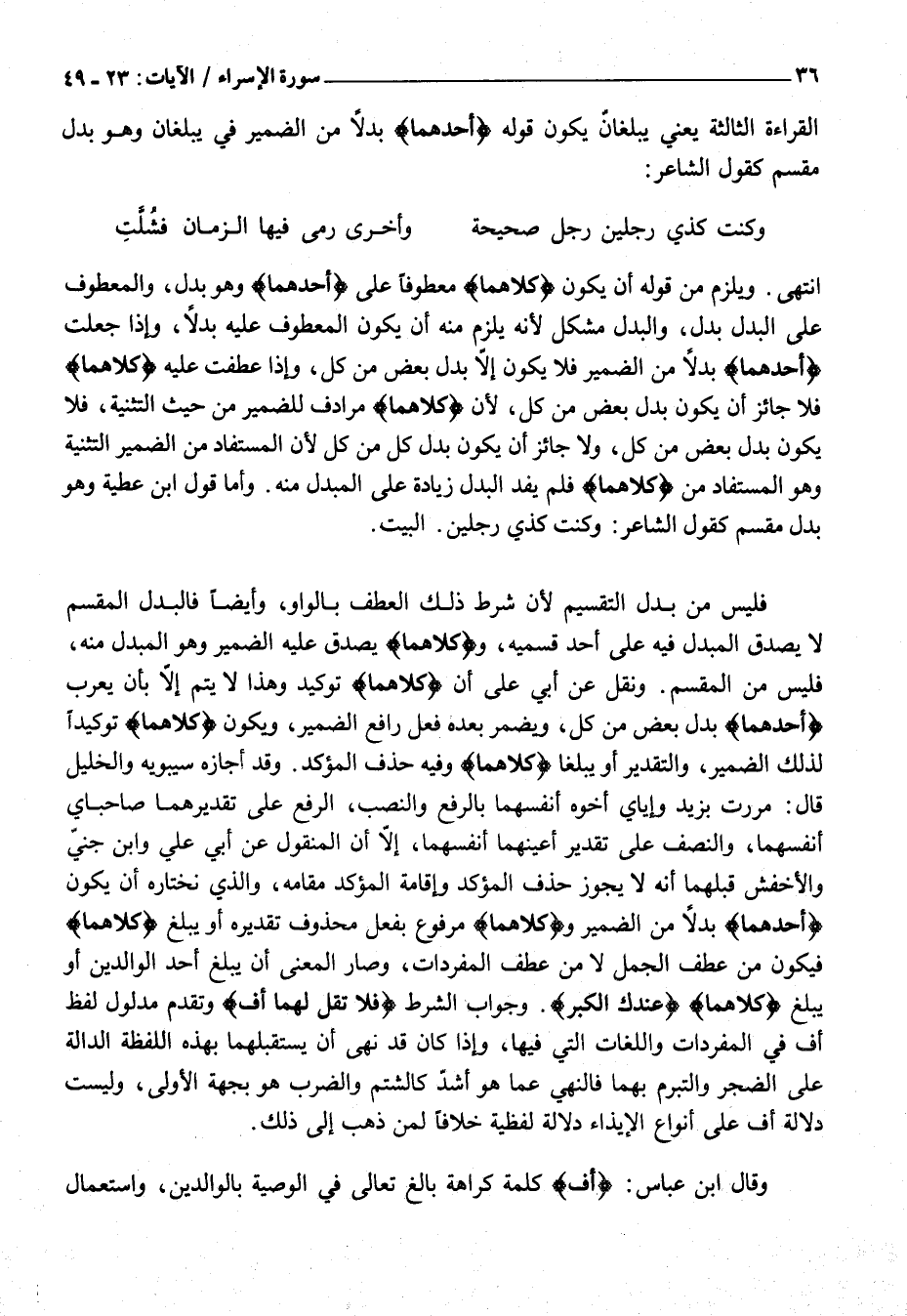 فَلَيْسَ مِنْ بَدَلِ التَّقْسِيمِ لِأَنَّ شَرْطَ ذَلِكَ الْعَطْفُ بِالْوَاوِ، وأَيْضًا فَالْبَدَلُ الْمُقَسَّمُ لَا يَصْدُقُ الْمُبْدَلُ فِيهِ على أحد قسميه، وكِلاهُما يَصْدُقُ عَلَيْهِ الضَّمِيرُ وَهُوَ الْمُبْدَلُ مِنْهُ، فَلَيْسَ مِنَ الْمُقَسَّمِ. وَنُقِلَ عَنْ أَبِي عَلِيٍّ أَنَّ كِلاهُما تَوْكِيدٌ وَهَذَا لَا يَتِمُّ إِلَّا بِأَنْ يُعْرَبَ أَحَدُهُما بَدَلَ بَعْضٍ مِنْ كُلٍّ، وَيُضْمَرَ بعده فعل رافع الضمير، وَيَكُونُ كِلاهُما تَوْكِيدًا لِذَلِكَ الضَّمِيرِ، وَالتَّقْدِيرُ أَوْ يَبْلُغَا كِلاهُما وَفِيهِ حَذْفُ الْمُؤَكِّدِ. وَقَدْ أَجَازَهُ سِيبَوَيْهِ وَالْخَلِيلُ قَالَ: مَرَرْتُ بِزَيْدٍ وَإِيَّايَ أَخُوهُ أَنْفُسَهُمَا بِالرَّفْعِ وَالنَّصْبِ، الرَّفْعُ عَلَى تَقْدِيرِهِمَا صَاحِبَايَ أنفسهما، والنصف عَلَى تَقْدِيرِ أَعْيُنِهِمَا أَنْفُسَهُمَا، إِلَّا أَنَّ الْمَنْقُولَ عَنْ أَبِي عَلِيٍّ وَابْنِ جِنِّي وَالْأَخْفَشِ قَبْلَهُمَا أَنَّهُ لَا يَجُوزُ حَذْفُ الْمُؤَكَّدِ وَإِقَامَةُ الْمُؤَكِّدِ مَقَامَهُ، وَالَّذِي نَخْتَارُهُ أَنْ يَكُونَ أَحَدُهُما بَدَلًا من الضمير وكِلاهُما مَرْفُوعٌ بِفِعْلٍ مَحْذُوفٍ تَقْدِيرُهُ أَوْ يَبْلُغَ كِلاهُما فَيَكُونُ مِنْ عَطْفِ الْجُمَلِ لَا مِنْ عَطْفِ الْمُفْرَدَاتِ، وَصَارَ الْمَعْنَى أَنْ يَبْلُغَ أَحَدُ الْوَالِدَيْنِ أَوْ يَبْلُغَ كِلاهُما عِنْدَكَ الْكِبَرَ. وَجَوَابُ الشَّرْطِ فَلا تَقُلْ لَهُما أُفٍّ وَتَقَدَّمَ مَدْلُولُ لَفْظِ أُفٍّ فِي الْمُفْرَدَاتِ وَاللُّغَاتِ الَّتِي فِيهَا، وَإِذَا كَانَ قَدْ نَهَى أَنْ يَسْتَقْبِلَهُمَا بِهَذِهِ اللَّفْظَةِ الدَّالَّةِ عَلَى الضَّجَرِ وَالتَّبَرُّمِ بِهِمَا فَالنَّهْيُ عَمَّا هُوَ أَشَدُّ كَالشَّتْمِ وَالضَّرْبِ هُوَ بِجِهَةِ الْأَوْلَى، وَلَيْسَتْ دَلَالَةُ أُفٍّ عَلَى أَنْوَاعِ الْإِيذَاءِ دَلَالَةً لَفْظِيَّةً خِلَافًا لِمَنْ ذَهَبَ إِلَى ذَلِكَ.