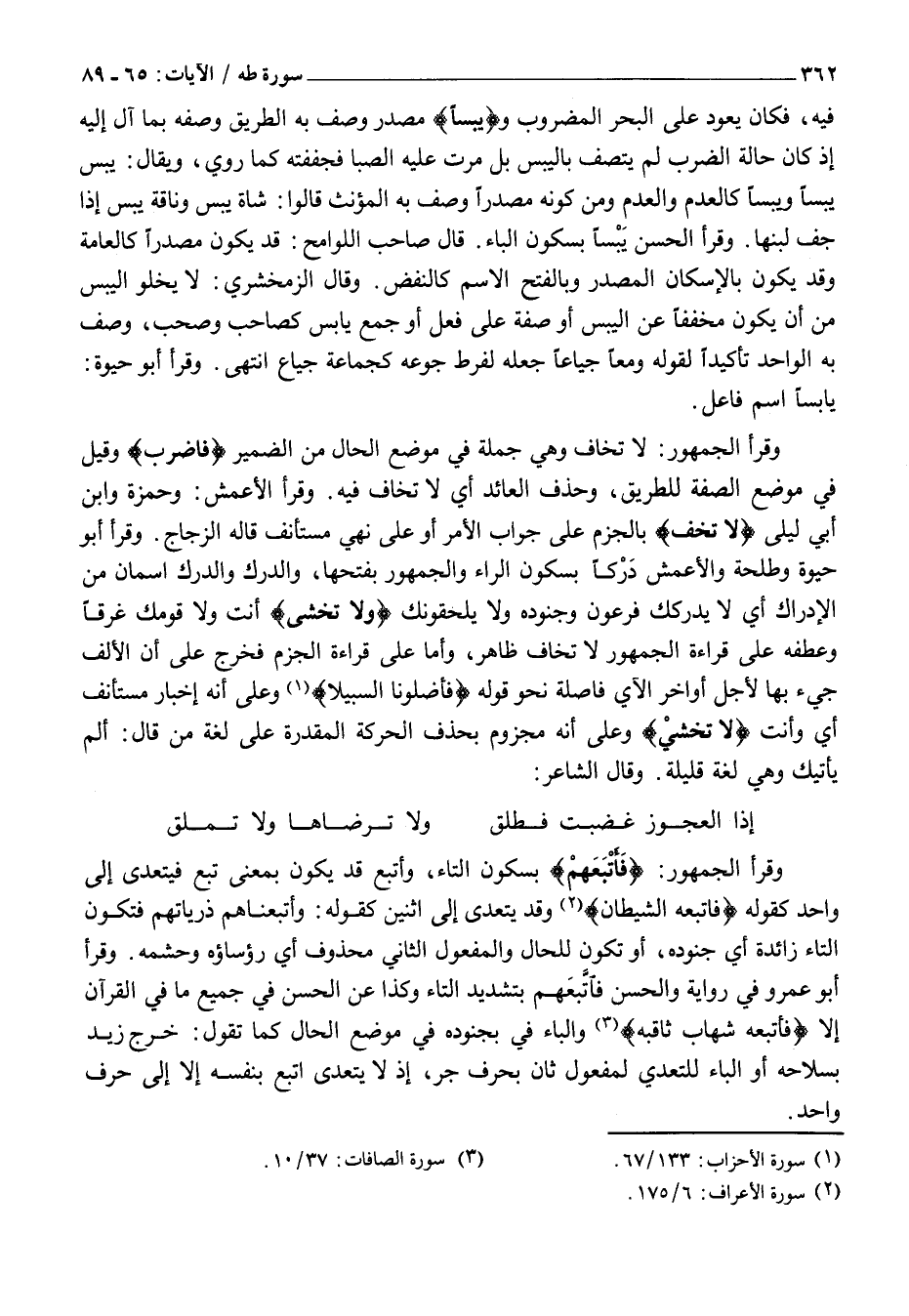 فِيهِ، فَكَانَ يَعُودُ عَلَى البحر المضروب ويَبَساً مَصْدَرٌ وُصِفَ بِهِ الطَّرِيقُ وَصَفَهُ بِمَا آلَ إِلَيْهِ إِذْ كَانَ حَالَةَ الضَّرْبِ لَمْ يَتَّصِفْ بِالْيُبْسِ بَلْ مَرَّتْ عَلَيْهِ الصَّبَا فَجَفَّفَتْهُ كَمَا رُوِيَ، وَيُقَالُ: يَبَسَ يُبْسًا وَيَبَسًا كَالْعُدْمِ وَالْعَدَمِ وَمِنْ كَوْنِهِ مَصْدَرًا وُصِفَ بِهِ الْمُؤَنَّثُ قَالُوا: شَاةٌ يَبَسٌ وَنَاقَةٌ يَبَسٌ إِذَا جَفَّ لَبَنُهَا. وَقَرَأَ الْحَسَنُ يَبْسًا بِسُكُونِ الْبَاءِ. قَالَ صَاحِبُ اللَّوَامِحِ: قَدْ يَكُونُ مَصْدَرًا كَالْعَامَّةِ وَقَدْ يَكُونُ بِالْإِسْكَانِ الْمَصْدَرَ وَبِالْفَتْحِ الِاسْمَ كَالنَّفْضِ. وَقَالَ الزَّمَخْشَرِيُّ: لَا يَخْلُو الْيَبَسُ مِنْ أَنْ يَكُونَ مُخَفَّفًا عَنِ الْيَبْسِ أَوْ صِفَةً عَلَى فُعْلٍ أَوْ جَمْعَ يَابِسٍ كَصَاحِبٍ وَصَحْبٍ، وُصِفَ بِهِ الْوَاحِدُ تَأْكِيدًا لِقَوْلِهِ وَمَعًا جِيَاعًا جَعَلَهُ لِفَرْطِ جُوعِهِ كَجَمَاعَةِ جِيَاعٍ انْتَهَى. وَقَرَأَ أَبُو حَيْوَةَ: