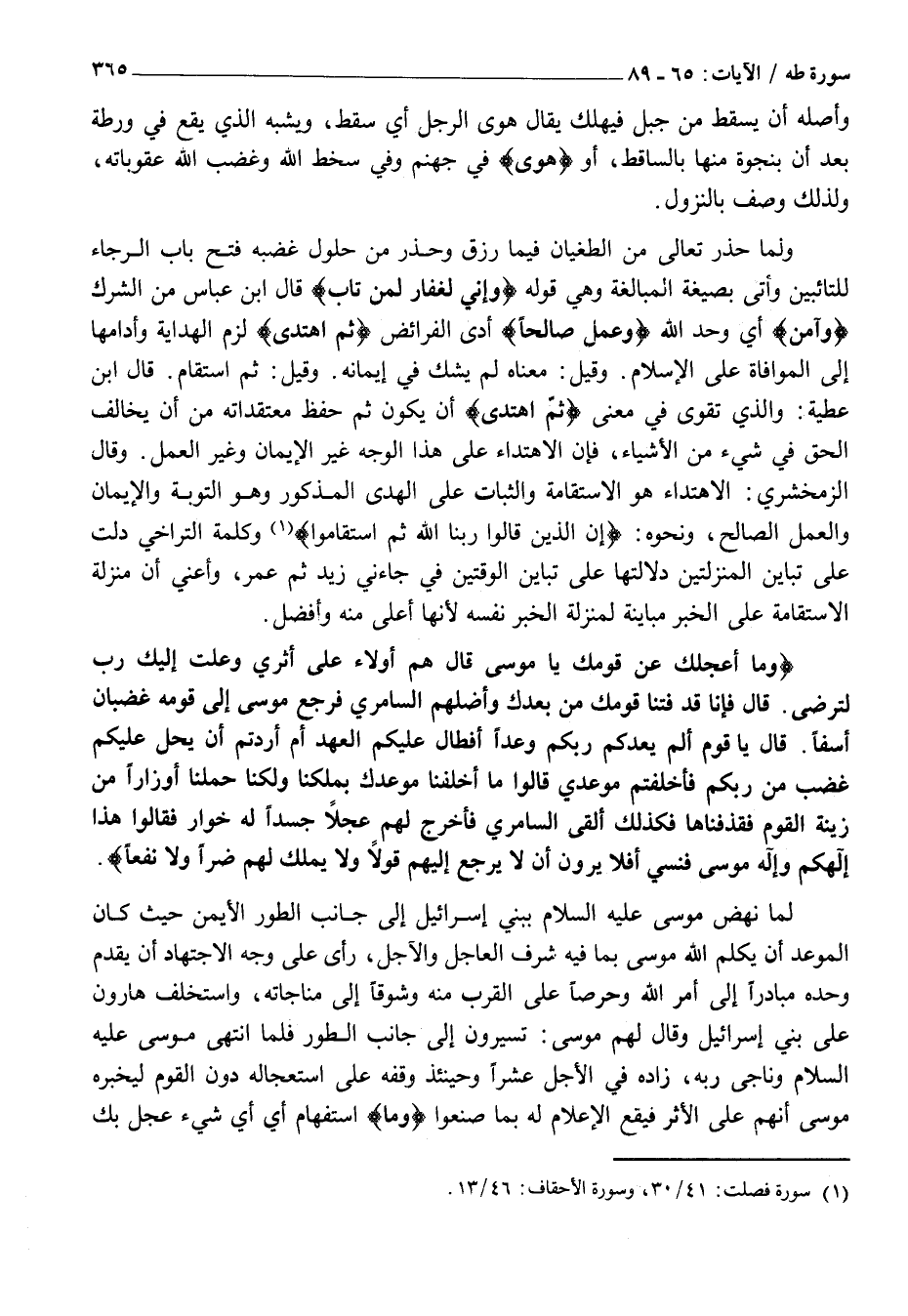 وَما أَعْجَلَكَ عَنْ قَوْمِكَ يا مُوسى قالَ هُمْ أُولاءِ عَلى أَثَرِي وَعَجِلْتُ إِلَيْكَ رَبِّ لِتَرْضى. قالَ فَإِنَّا قَدْ فَتَنَّا قَوْمَكَ مِنْ بَعْدِكَ وَأَضَلَّهُمُ السَّامِرِيُّ فَرَجَعَ مُوسى إِلى قَوْمِهِ غَضْبانَ أَسِفاً. قالَ يا قَوْمِ أَلَمْ يَعِدْكُمْ رَبُّكُمْ وَعْداً حَسَناً أَفَطالَ عَلَيْكُمُ الْعَهْدُ أَمْ أَرَدْتُمْ أَنْ يَحِلَّ عَلَيْكُمْ غَضَبٌ مِنْ رَبِّكُمْ فَأَخْلَفْتُمْ مَوْعِدِي قالُوا مَا أَخْلَفْنا مَوْعِدَكَ بِمَلْكِنا وَلكِنَّا حُمِّلْنا أَوْزاراً مِنْ زِينَةِ الْقَوْمِ فَقَذَفْناها فَكَذلِكَ أَلْقَى السَّامِرِيُّ فَأَخْرَجَ لَهُمْ عِجْلًا جَسَداً لَهُ خُوارٌ فَقالُوا هَذَا إِلهُكُمْ وَإِلهُ مُوسى فَنَسِيَ أَفَلا يَرَوْنَ أَلَّا يَرْجِعُ إِلَيْهِمْ قَوْلًا وَلا يَمْلِكُ لَهُمْ ضَرًّا وَلا نَفْعاً.