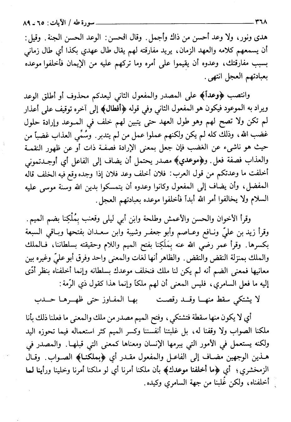 أَيْ لَا يَكُونُ مِنْهَا سَقْطَةٌ فَتَشْتَكِيَ، وَفَتْحُ الْمِيمِ مَصْدَرٌ مِنْ مَلَكَ وَالْمَعْنَى مَا فَعَلْنَا ذَلِكَ بِأَنَّا مَلَكْنَا الصَّوَابَ وَلَا وَقَفْنَا لَهُ، بَلْ غَلَبَتْنَا أَنْفُسُنَا وَكَسْرُ الْمِيمِ كَثُرَ اسْتِعْمَالُهُ فِيمَا تَحُوزُهُ الْيَدُ وَلَكِنَّهُ يُسْتَعْمَلُ فِي الْأُمُورِ الَّتِي يُبْرِمُهَا الْإِنْسَانُ وَمَعْنَاهَا كَمَعْنَى الَّتِي قَبْلَهَا. وَالْمَصْدَرُ فِي هَذَيْنِ الْوَجْهَيْنِ مُضَافٌ إِلَى الْفَاعِلِ وَالْمَفْعُولُ مُقَدَّرٌ أي بِمَلْكِنا الصَّوَابُ. وَقَالَ الزَّمَخْشَرِيُّ أَيْ مَا أَخْلَفْنا مَوْعِدَكَ بِأَنْ مَلَكْنَا أَمْرَنَا أَيْ لَوْ مَلَكْنَا أَمَرْنَا وَخَلَّيْنَا وَرَأَيْنَا لَمَا أَخْلَفْنَاهُ، وَلَكِنْ غُلِبْنَا مِنْ جِهَةِ السَّامِرِيِّ وَكَيْدِهِ.