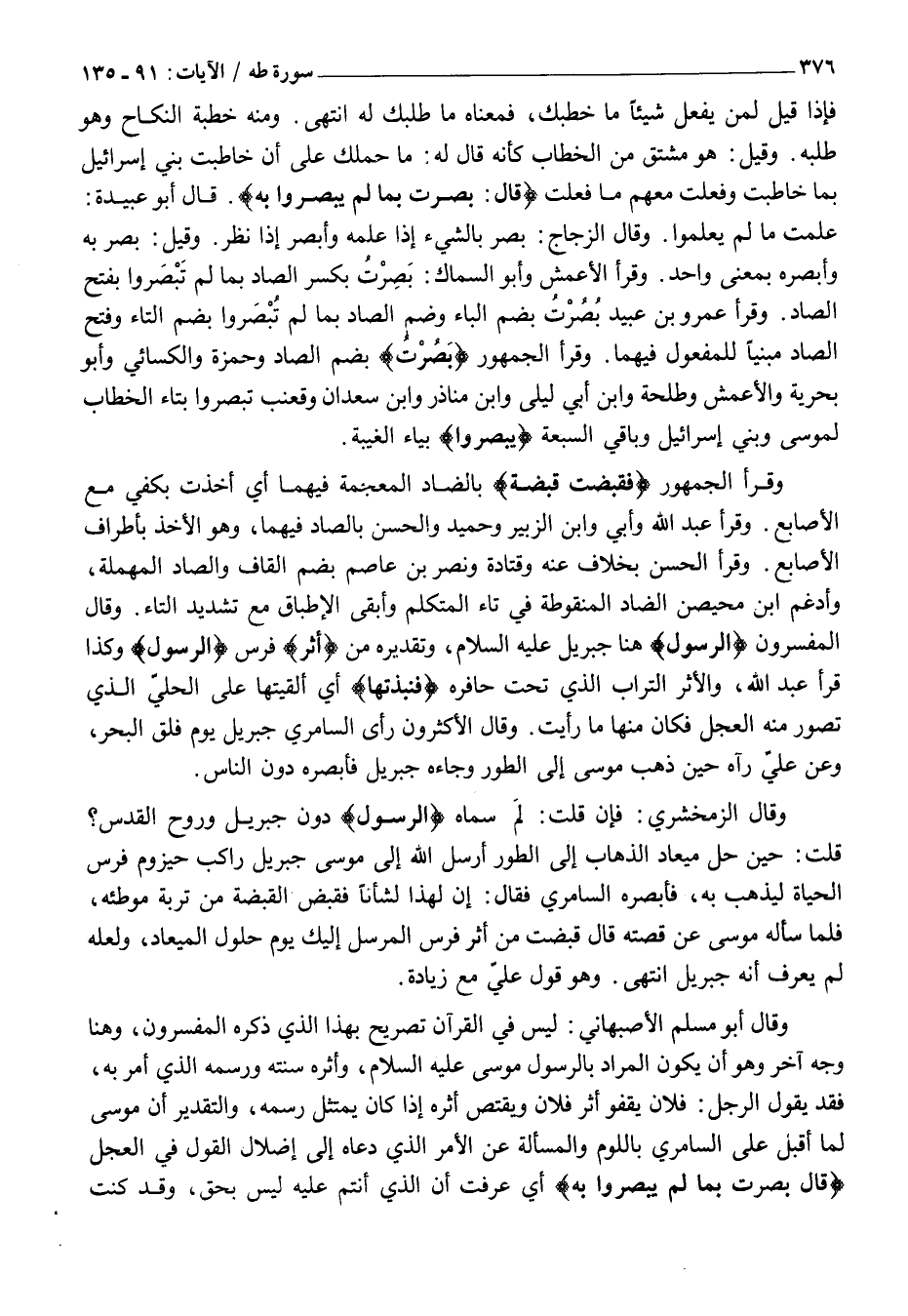 وَقَالَ أَبُو مُسْلِمٍ الْأَصْبَهَانِيُّ: لَيْسَ فِي الْقُرْآنِ تَصْرِيحٌ بِهَذَا الَّذِي ذَكَرَهُ الْمُفَسِّرُونَ، وَهُنَا وَجْهٍ آخَرَ وَهُوَ أَنْ يَكُونَ الْمُرَادُ بِالرَّسُولِ مُوسَى عَلَيْهِ السَّلَامُ، وَأَثَرُهُ سُنَّتُهُ وَرَسْمُهُ الَّذِي أَمَرَ بِهِ، فَقَدْ يَقُولُ الرَّجُلُ: فُلَانٌ يَقْفُو أَثَرَ فُلَانٍ وَيَقْتَصُّ أَثَرَهُ إِذَا كَانَ يَمْتَثِلُ رَسْمَهُ، وَالتَّقْدِيرُ أَنَّ مُوسَى لَمَّا أَقْبَلَ عَلَى السَّامِرِيِّ بِاللَّوْمِ وَالْمَسْأَلَةِ عَنِ الْأَمْرِ الَّذِي دَعَاهُ إِلَى إِضْلَالِ الْقَوْلِ فِي الْعِجْلِ قالَ بَصُرْتُ بِما لَمْ يَبْصُرُوا بِهِ أَيْ عَرَفْتُ أَنَّ الَّذِي أَنْتُمْ عَلَيْهِ لَيْسَ بِحَقٍّ، وَقَدْ كُنْتُ