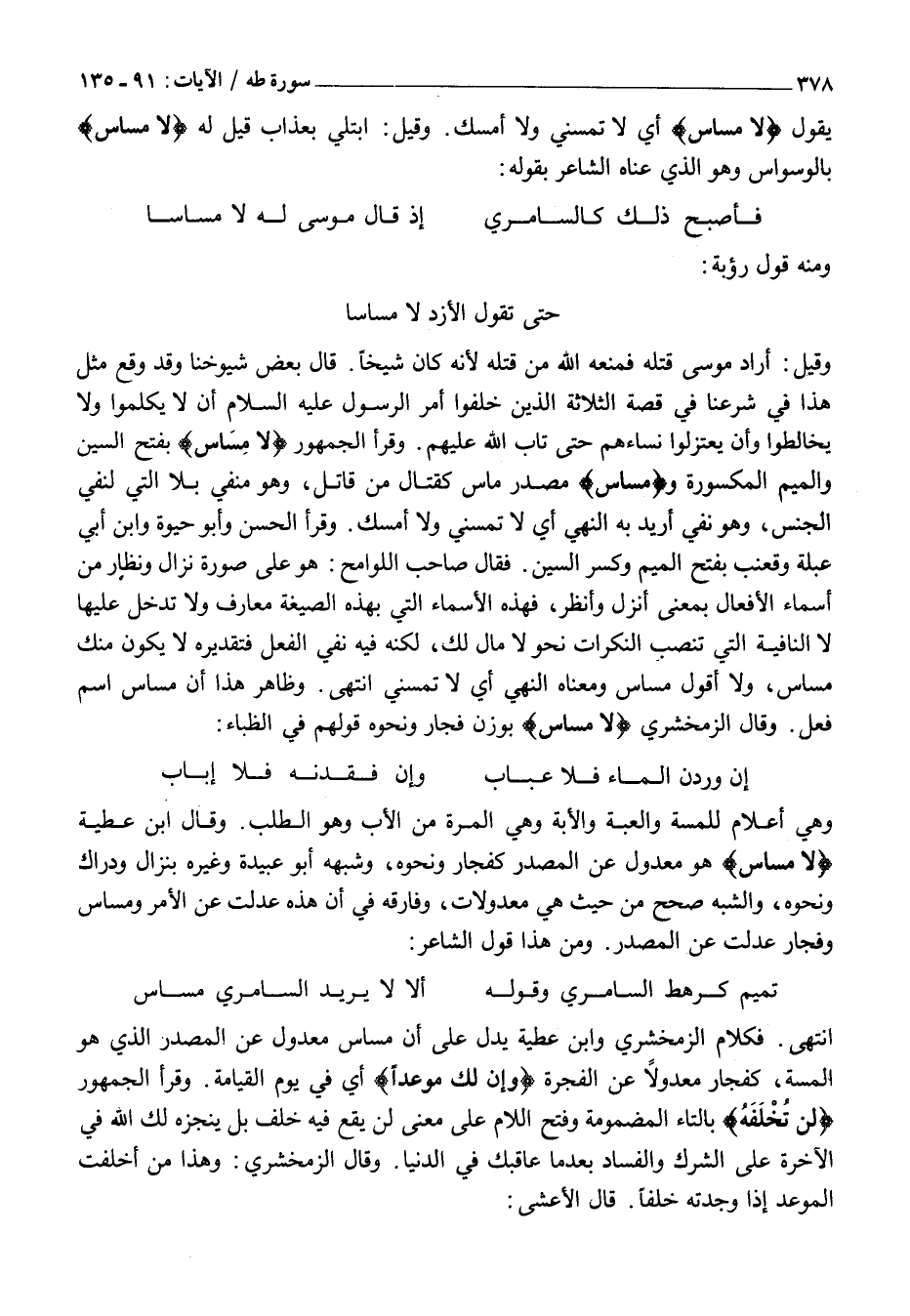 حَتَّى تَقُولَ الْأَزْدُ لَا مِسَاسَا وَقِيلَ: أَرَادَ مُوسَى قَتْلَهُ فَمَنَعَهُ اللَّهُ مِنْ قَتْلِهِ لِأَنَّهُ كَانَ شَيْخًا. قَالَ بَعْضُ شُيُوخِنَا وَقَدْ وَقَعَ مِثْلُ هَذَا فِي شَرْعِنَا فِي قِصَّةِ الثَّلَاثَةِ الَّذِينَ خَلَفُوا أَمْرَ الرَّسُولِ عَلَيْهِ السَّلَامُ أَنْ لَا يُكَلَّمُوا وَلَا يُخَالَطُوا وَأَنْ يَعْتَزِلُوا نِسَاءَهُمْ حَتَّى تَابَ اللَّهُ عَلَيْهِمْ. وَقَرَأَ الْجُمْهُورُ لَا مِساسَ بِفَتْحِ السين والميم المكسورة ومِساسَ مَصْدَرُ مَاسَّ كَقِتَالٍ مِنْ قَاتَلَ، وَهُوَ مَنْفِيٌّ بِلَا الَّتِي لِنَفْيِ الْجِنْسِ، وَهُوَ نَفْيٌ أُرِيدَ بِهِ النَّهْيُ أَيْ لَا تَمَسَّنِي وَلَا أَمَسَّكَ. وَقَرَأَ الْحَسَنُ وَأَبُو حَيْوَةَ وَابْنُ أَبِي عَبْلَةَ وَقُعْنَبٌ بِفَتْحِ الْمِيمِ وَكَسْرِ السِّينِ. فَقَالَ صَاحِبُ اللَّوَامِحِ: هُوَ عَلَى صُورَةِ نِزَالِ وَنِظِارِ مِنْ أَسْمَاءِ الْأَفْعَالِ بِمَعْنَى انْزِلْ وَانْظُرْ، فَهَذِهِ الْأَسْمَاءُ الَّتِي بِهَذِهِ الصِّيغَةِ مَعَارِفُ وَلَا تَدْخُلُ عَلَيْهَا لا النَّافِيَةُ الَّتِي تَنْصِبُ النَّكِرَاتِ نَحْوَ لَا مَالَ لَكَ، لَكِنَّهُ فِيهِ نَفْيُ الْفِعْلِ فَتَقْدِيرُهُ لَا يَكُونُ مِنْكَ مِسَاسٌ، وَلَا أَقُولُ مِسَاسَ وَمَعْنَاهُ النَّهْيُ أَيْ لَا تَمَسَّنِي انْتَهَى. وَظَاهِرُ هَذَا أَنَّ مِسَاسَ اسْمُ فِعْلٍ. وَقَالَ الزَّمَخْشَرِيُّ لَا مِساسَ بِوَزْنِ فِجَارٍ وَنَحْوُهُ قَوْلُهُمْ فِي الظِّبَاءِ: