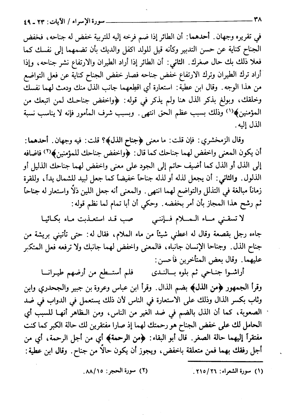 وَقَالَ الزَّمَخْشَرِيُّ: فَإِنْ قُلْتَ: مَا مَعْنَى جَناحَ الذُّلِّ؟ قُلْتُ: فِيهِ وَجْهَانِ. أَحَدُهُمَا: