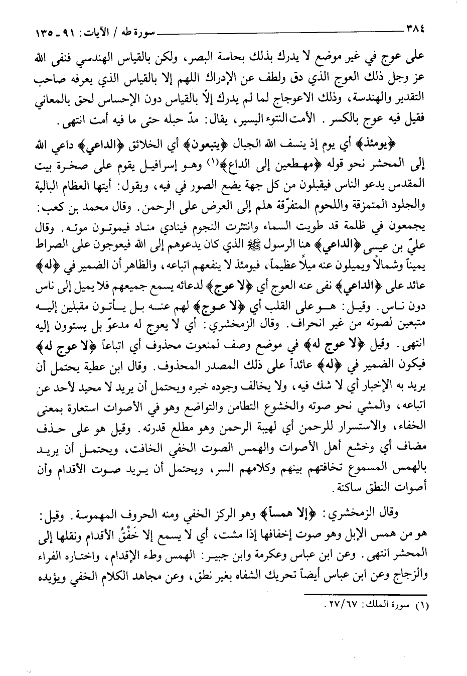 يُجْمَعُونَ فِي ظُلْمَةٍ قَدْ طُوِيَتِ السَّمَاءُ وَانْتَثَرَتِ النُّجُومُ فَيُنَادِي مُنَادٍ فَيَمُوتُونَ مَوْتَةً. وَقَالَ عَلِيُّ بْنُ عِيسَى الدَّاعِيَ هُنَا الرسول صلى الله عليه وَسَلَّمَ الَّذِي كَانَ يَدْعُوهُمْ إِلَى اللَّهِ فَيَعُوجُونَ عَلَى الصِّرَاطِ يَمِينًا وَشِمَالًا وَيَمِيلُونَ عَنْهُ مَيْلًا عَظِيمًا، فَيَوْمَئِذٍ لَا يَنْفَعُهُمُ اتِّبَاعُهُ، وَالظَّاهِرُ أَنَّ الضَّمِيرَ فِي لَهُ عَائِدٌ عَلَى الدَّاعِيَ نَفَى عَنْهُ الْعِوَجَ أَيْ لَا عِوَجَ لدعائه يسمع جميعهم فلا يميل إلى ناس دون ناس. وَقِيلَ: هُوَ عَلَى الْقَلْبِ أَيْ لَا عِوَجَ لَهُمْ عَنْهُ بَلْ يَأْتُونَ مُقْبِلِينَ إِلَيْهِ مُتَّبِعِينَ لِصَوْتِهِ مِنْ غَيْرِ انْحِرَافٍ. وَقَالَ الزَّمَخْشَرِيُّ: أَيْ لَا يُعْوَجُّ لَهُ مَدْعُوٌّ بَلْ يَسْتَوُونَ إِلَيْهِ انْتَهَى. وَقِيلَ لَا عِوَجَ لَهُ فِي مَوْضِعِ وَصْفٍ لِمَنْعُوتٍ مَحْذُوفٍ أَيِ اتِّبَاعًا لَا عِوَجَ لَهُ فَيَكُونُ الضَّمِيرُ فِي لَهُ عَائِدًا عَلَى ذَلِكَ الْمَصْدَرِ الْمَحْذُوفُ. وَقَالَ ابْنُ عَطِيَّةَ يُحْتَمَلُ أَنْ يُرِيدَ بِهِ الْإِخْبَارَ أَيْ لَا شَكَّ فِيهِ، وَلَا يُخَالِفُ وُجُودَهُ خَبَرُهُ وَيُحْتَمَلُ أَنْ يُرِيدَ لَا مَحِيدَ لِأَحَدٍ عَنِ اتِّبَاعِهِ، وَالْمَشْيِ نَحْوَ صَوْتِهِ وَالْخُشُوعُ التَّطَامُنُ وَالتَّوَاضُعُ وَهُوَ فِي الْأَصْوَاتِ اسْتِعَارَةٌ بِمَعْنَى الْخَفَاءِ، وَالِاسْتِسْرَارُ لِلرَّحْمَنِ أَيْ لِهَيْبَةِ الرَّحْمَنِ وَهُوَ مُطَّلِعٌ قُدْرَتُهُ. وَقِيلَ هُوَ عَلَى حَذْفِ مُضَافٍ أَيْ وَخَشَعَ أَهْلُ الْأَصْوَاتِ وَالْهَمْسُ الصَّوْتُ الْخَفِيُّ الْخَافِتُ، وَيُحْتَمَلُ أَنْ يُرِيدَ بِالْهَمْسِ الْمَسْمُوعِ تَخَافُتُهُمْ بَيْنَهُمْ وَكَلَامُهُمُ السِّرُّ، وَيُحْتَمَلُ أَنْ يُرِيدَ صَوْتَ الْأَقْدَامِ وَأَنَّ أَصْوَاتَ النُّطْقِ سَاكِنَةٌ.