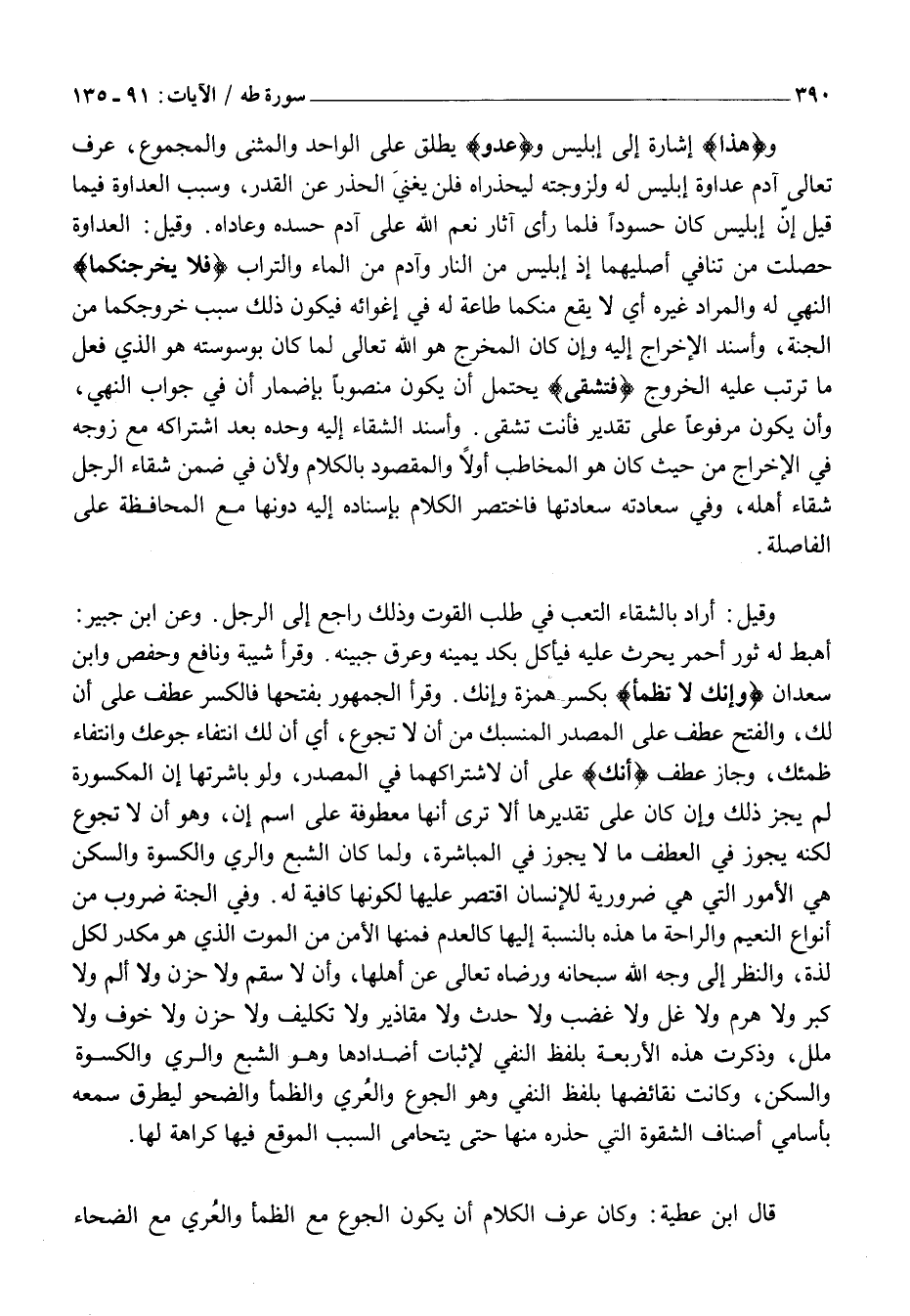 أُهْبِطَ لَهُ ثَوْرٌ أَحْمَرُ يَحْرُثُ عَلَيْهِ فَيَأْكُلُ بِكَدِّ يَمِينِهِ وَعَرَقِ جَبِينِهِ. وَقَرَأَ شَيْبَةُ وَنَافِعٌ وَحَفْصٌ وَابْنُ سعدان وَأَنَّكَ لا تَظْمَؤُا بِكَسْرِ هَمْزَةٍ وَإِنَّكَ. وَقَرَأَ الْجُمْهُورُ بِفَتْحِهَا فَالْكَسْرُ عَطْفٌ عَلَى أَنَّ لَكَ، وَالْفَتْحُ عَطْفٌ عَلَى الْمَصْدَرِ الْمُنْسَبِكِ مِنَ أَنْ لَا تَجُوعَ، أَيْ أَنَّ لَكَ انْتِفَاءَ جَوْعِكَ وَانْتِفَاءَ ظَمَئِكَ، وَجَازَ عَطْفُ أَنَّكَ عَلَى أَنَّ لِاشْتِرَاكِهِمَا فِي الْمَصْدَرِ، وَلَوْ بَاشَرَتْهَا إِنَّ الْمَكْسُورَةُ لَمْ يَجُزْ ذَلِكَ وَإِنْ كَانَ عَلَى تَقْدِيرِهَا أَلَا تَرَى أَنَّهَا مَعْطُوفَةٌ عَلَى اسْمِ إِنَّ، وَهُوَ أَنْ لَا تَجُوعَ لَكِنَّهُ يَجُوزُ فِي الْعَطْفِ مَا لَا يَجُوزُ فِي الْمُبَاشَرَةِ، وَلَمَّا كَانَ الشِّبَعُ وَالرِّيُّ وَالْكُسْوَةُ وَالسَّكَنُ هِيَ الْأُمُورَ الَّتِي هِيَ ضَرُورِيَّةٌ لِلْإِنْسَانِ اقْتَصَرَ عَلَيْهَا لِكَوْنِهَا كَافِيَةً لَهُ. وَفِي الْجَنَّةِ ضُرُوبٌ مِنْ أَنْوَاعِ النَّعِيمِ وَالرَّاحَةِ مَا هَذِهِ بِالنِّسْبَةِ إِلَيْهَا كَالْعَدَمِ فَمِنْهَا الْأَمْنُ مِنَ الْمَوْتِ الَّذِي هُوَ مُكَدِّرٌ لِكُلِّ لَذَّةٍ، وَالنَّظَرُ إِلَى وَجْهِ اللَّهِ سُبْحَانَهُ وَرِضَاهُ تَعَالَى عَنْ أَهْلِهَا، وَأَنْ لَا سَقَمَ وَلَا حُزْنَ وَلَا أَلَمَ وَلَا كِبَرَ وَلَا هَرَمَ وَلَا غِلَّ وَلَا غَضَبَ وَلَا حَدَثَ وَلَا مَقَاذِيرَ وَلَا تَكْلِيفَ وَلَا حُزْنَ وَلَا خَوْفَ وَلَا مَلَلَ، وَذُكِرَتْ هَذِهِ الْأَرْبَعَةُ بِلَفْظِ النَّفْيِ لِإِثْبَاتِ أَضْدَادِهَا وَهُوَ الشِّبَعُ وَالرِّيُّ وَالْكُسْوَةُ وَالسَّكَنُ، وَكَانَتْ نَقَائِضُهَا بِلَفْظِ النَّفْيِ وَهُوَ الْجُوعُ وَالْعُرْيُ وَالظَّمَأُ وَالضَّحْوُ لِيُطْرَقَ سَمْعُهُ بِأَسَامِي أَصْنَافِ الشِّقْوَةِ الَّتِي حَذَّرَهُ مِنْهَا حَتَّى يَتَحَامَى السَّبَبَ الْمُوقِعَ فِيهَا كَرَاهَةً لَهَا.