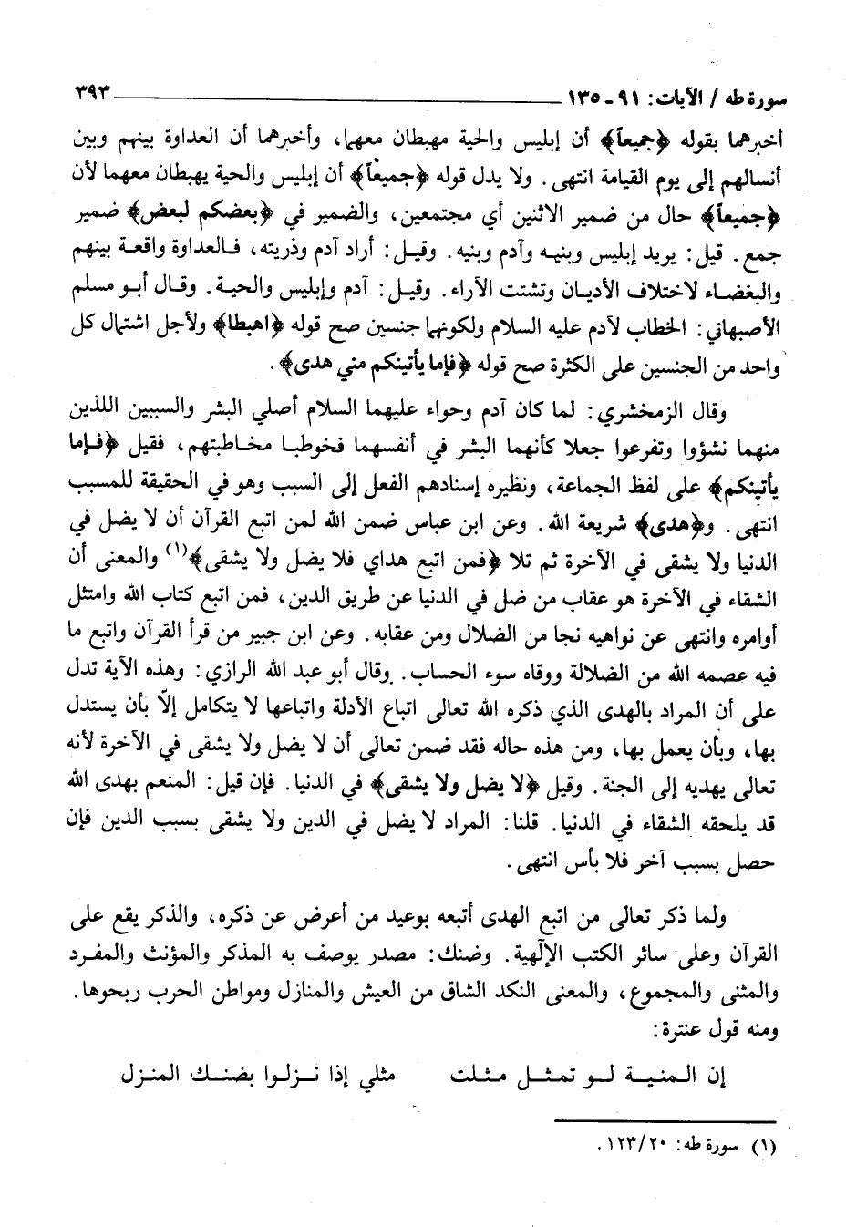وَقَالَ الزَّمَخْشَرِيُّ: لَمَّا كَانَ آدَمَ وَحَوَّاءَ عَلَيْهِمَا السَّلَامُ أَصْلَيِ الْبَشَرِ والسببين اللذين منهما نشؤوا وَتَفَرَّعُوا جُعِلَا كَأَنَّهُمَا الْبَشَرُ فِي أَنْفُسِهِمَا فَخُوطِبَا مُخَاطَبَتَهُمْ، فَقِيلَ فَإِمَّا يَأْتِيَنَّكُمْ عَلَى لَفْظِ الْجَمَاعَةِ، وَنَظِيرُهُ إِسْنَادُهُمُ الْفِعْلَ إِلَى السَّبَبِ وَهُوَ فِي الْحَقِيقَةِ لِلْمُسَبِّبِ انْتَهَى. وهُدىً شَرِيعَةُ اللَّهِ. وَعَنِ ابْنِ عَبَّاسٍ ضَمِنَ اللَّهُ لِمَنِ اتَّبَعَ الْقُرْآنَ أَنْ لَا يَضِلَّ فِي الدُّنْيَا وَلَا يَشْقَى فِي الْآخِرَةِ ثُمَّ تَلَا فَمَنِ اتَّبَعَ هُدايَ فَلا يَضِلُّ وَلا يَشْقى «1» وَالْمَعْنَى أَنَّ الشَّقَاءَ فِي الْآخِرَةِ هُوَ عِقَابُ مَنْ ضَلَّ فِي الدُّنْيَا عَنْ طَرِيقِ الدِّينِ، فَمَنِ اتَّبَعَ كِتَابَ اللَّهِ وَامْتَثَلَ أَوَامِرُهُ وَانْتَهَى عَنْ نَوَاهِيهِ نَجَا مِنَ الضَّلَالِ وَمِنْ عِقَابِهِ. وَعَنِ ابْنِ جُبَيْرٍ مِنْ قَرَأَ الْقُرْآنَ وَاتَّبَعَ مَا فِيهِ عَصَمَهُ اللَّهُ مِنَ الضَّلَالَةِ وَوَقَاهُ سُوءَ الْحِسَابِ. وَقَالَ أَبُو عَبْدِ اللَّهِ الرَّازِيُّ: وَهَذِهِ الْآيَةُ تَدُلُّ عَلَى أَنَّ الْمُرَادَ بِالْهُدَى الَّذِي ذَكَرَهُ اللَّهُ تَعَالَى اتِّبَاعُ الْأَدِلَّةِ وَاتِّبَاعُهَا لَا يَتَكَامَلُ إِلَّا بِأَنْ يَسْتَدِلَّ بِهَا، وَبِأَنْ يَعْمَلَ بِهَا، وَمَنْ هَذِهِ حَالُهُ فَقَدْ ضَمِنَ تَعَالَى أَنْ لَا يضل ولا يشقى في الْآخِرَةِ لِأَنَّهُ تَعَالَى يَهْدِيهِ إِلَى الْجَنَّةِ. وَقِيلَ فَلا يَضِلُّ وَلا يَشْقى في الدُّنْيَا. فَإِنْ قِيلَ: الْمُنْعِمُ بِهُدَى اللَّهِ قَدْ يَلْحَقُهُ الشَّقَاءُ فِي الدُّنْيَا. قُلْنَا: الْمُرَادُ لَا يَضِلُّ فِي الدِّينِ وَلَا يَشْقَى بِسَبَبِ الدَّيْنِ فَإِنْ حَصَلَ بِسَبَبٍ آخَرَ فَلَا بَأْسَ انْتَهَى.