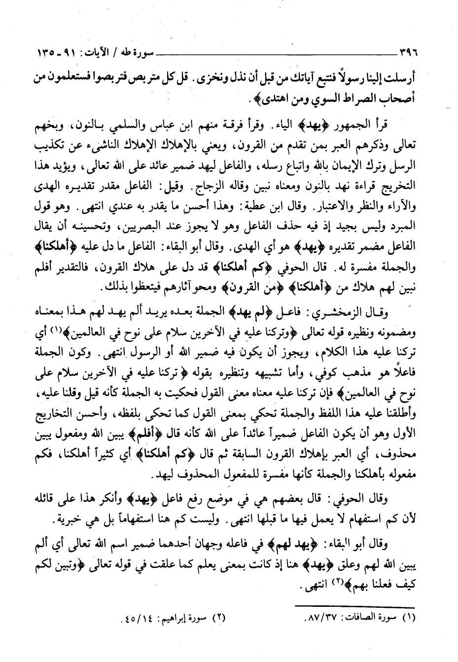 وَقَالَ أَبُو الْبَقَاءِ: يَهْدِ لَهُمْ فِي فَاعِلِهِ وَجْهَانِ أَحَدُهُمَا ضَمِيرُ اسْمِ اللَّهِ تَعَالَى أَيْ أَلَمْ يُبَيِّنِ اللَّهُ لَهُمْ وَعَلَّقَ يَهْدِ هُنَا إِذْ كَانَتْ بِمَعْنَى يَعْلَمُ كَمَا عُلِّقَتْ فِي قَوْلِهِ تَعَالَى وَتَبَيَّنَ لَكُمْ كَيْفَ فَعَلْنا بِهِمْ «2» انتهى.