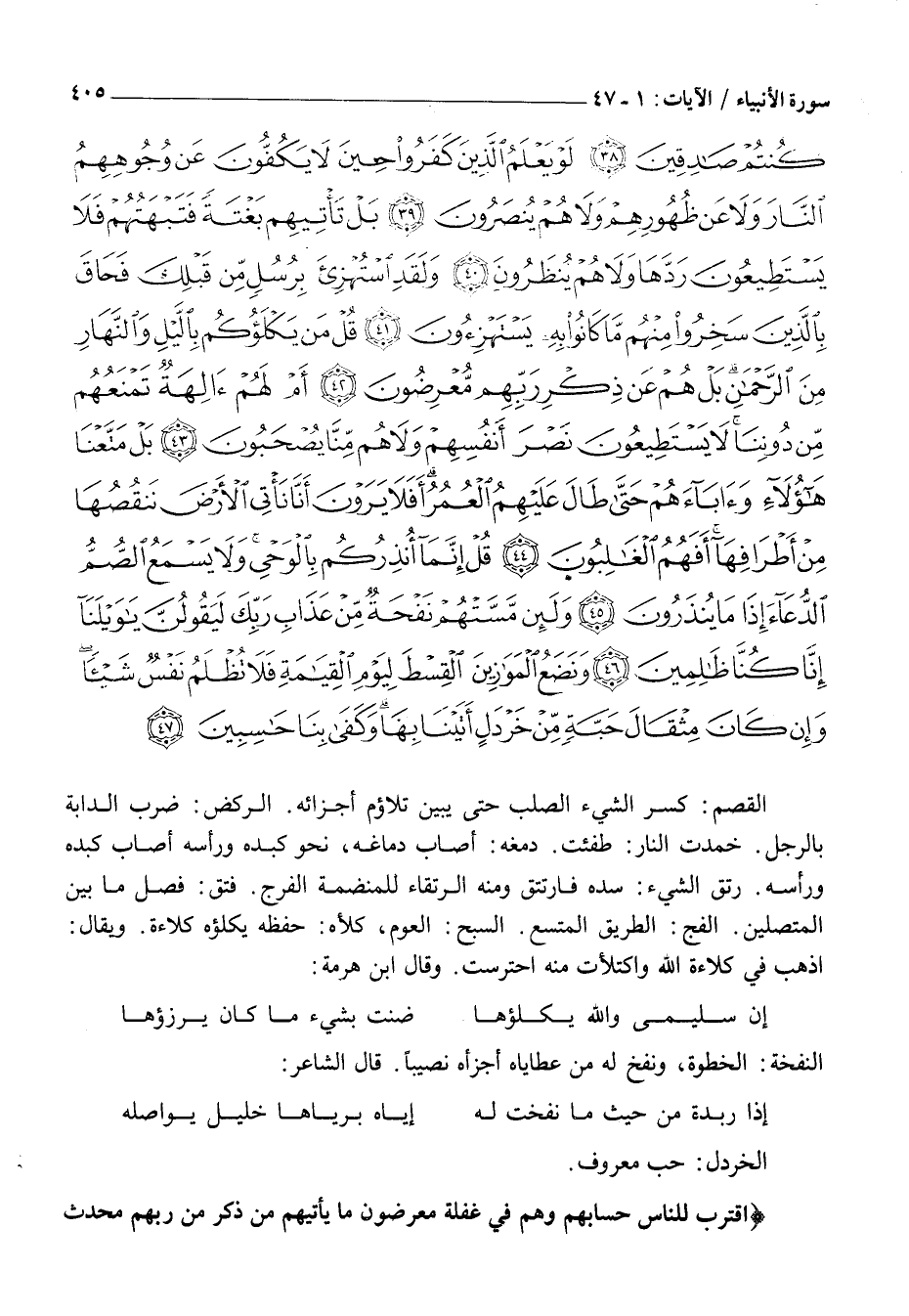 الْقَصْمُ: كَسْرُ الشَّيْءِ الصُّلْبِ حَتَّى يَبِينَ تَلَاؤُمُ أَجْزَائِهِ. الرَّكْضُ: ضَرْبُ الدَّابَّةِ بِالرِّجْلِ. خَمَدَتِ النَّارُ: طُفِئَتْ. دَمِغَهُ: أَصَابَ دِمَاغَهُ، نَحْوَ كَبِدَهُ وَرَأِسَهُ أَصَابَ كَبِدَهُ وَرَأْسَهُ. رَتَقَ الشَّيْءَ: سَدَّهُ فَارْتَتَقَ وَمِنْهُ الرَّتْقَاءُ لِلْمُنْضَمَّةِ الْفَرْجِ. فَتَقَ: فَصَلَ مَا بَيْنَ الْمُتَّصِلَيْنِ. الْفَجُّ: الطَّرِيقُ الْمُتَّسِعُ. السَّبْحُ: الْعَوْمُ، كَلَأَهُ: حَفِظَهُ يَكْلَؤُهُ كِلَاءَةً. وَيُقَالُ: