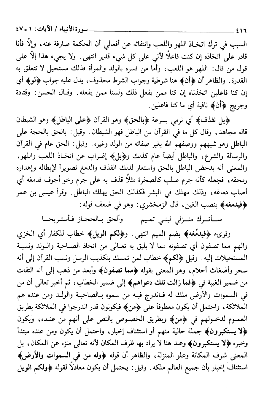 وقرىء فَيَدْمَغُهُ بِضَمِّ الْمِيمِ انْتَهَى. ولَكُمُ الْوَيْلُ خِطَابٌ لِلْكُفَّارِ أَيِ الْخِزْيُ وَالْهَمُّ مِمَّا تَصِفُونَ أَيْ تَصِفُونَهُ مِمَّا لَا يَلِيقُ بِهِ تَعَالَى مِنَ اتِّخَاذِ الصَّاحِبَةِ وَالْوَلَدِ وَنِسْبَةِ الْمُسْتَحِيلَاتِ إِلَيْهِ. وَقِيلَ لَكُمُ خِطَابٌ لِمَنْ تَمَسَّكَ بِتَكْذِيبِ الرُّسُلِ وَنَسَبَ الْقُرْآنَ إِلَى أَنَّهُ سِحْرٌ وَأَضْغَاثُ أَحْلَامٍ، وَهُوَ الْمَعْنِيُّ بِقَوْلِهِ مِمَّا تَصِفُونَ وَأَبْعَدَ مَنْ ذَهَبَ إِلَى أَنَّهُ الْتِفَاتٌ مِنْ ضَمِيرِ الْغَيْبَةِ فِي فَما زالَتْ تِلْكَ دَعْواهُمْ إِلَى ضَمِيرِ الْخِطَابِ، ثُمَّ أَخْبَرَ تَعَالَى أَنَّ مَنْ في السموات وَالْأَرْضِ مِلْكٌ لَهُ فَانْدَرَجَ فِيهِ مَنْ سَمَّوْهُ بِالصَّاحِبَةِ وَالْوَلَدِ وَمَنْ عِنْدَهُ هُمُ الْمَلَائِكَةُ، وَاحْتُمِلَ أَنْ يَكُونَ مَعْطُوفًا عَلَى مَنْ فَيَكُونُونَ قدر انْدَرَجُوا فِي الْمَلَائِكَةِ بِطَرِيقِ الْعُمُومِ لِدُخُولِهِمْ فِي مَنْ وَبِطَرِيقِ الْخُصُوصِ بِالنَّصِّ عَلَى أَنَّهُمْ مَنْ عِنْدَهُ، وَيَكُونُ لَا يَسْتَكْبِرُونَ جُمْلَةً حَالِيَّةً مِنْهُمْ أَوِ اسْتِئْنَافَ إِخْبَارٍ، وَاحْتُمِلَ أَنْ يَكُونَ وَمَنْ عِنْدَهُ مُبْتَدَأً وَخَبَرُهُ لَا يَسْتَكْبِرُونَ وعند هُنَا لَا يُرَادُ بِهَا ظَرْفُ الْمَكَانِ لِأَنَّهُ تَعَالَى مُنَزَّهٌ عَنِ الْمَكَانِ، بَلِ الْمَعْنَى شَرَفُ الْمَكَانَةِ وَعُلُوُّ الْمَنْزِلَةِ، وَالظَّاهِرُ أَنَّ قَوْلَهُ وَلَهُ مَنْ فِي السَّماواتِ وَالْأَرْضِ اسْتِئْنَافُ إِخْبَارٍ بِأَنَّ جَمِيعَ الْعَالَمِ مِلْكُهُ. وَقِيلَ: يُحْتَمَلُ أَنْ يَكُونَ مُعَادِلًا لِقَوْلِهِ وَلَكُمُ الْوَيْلُ