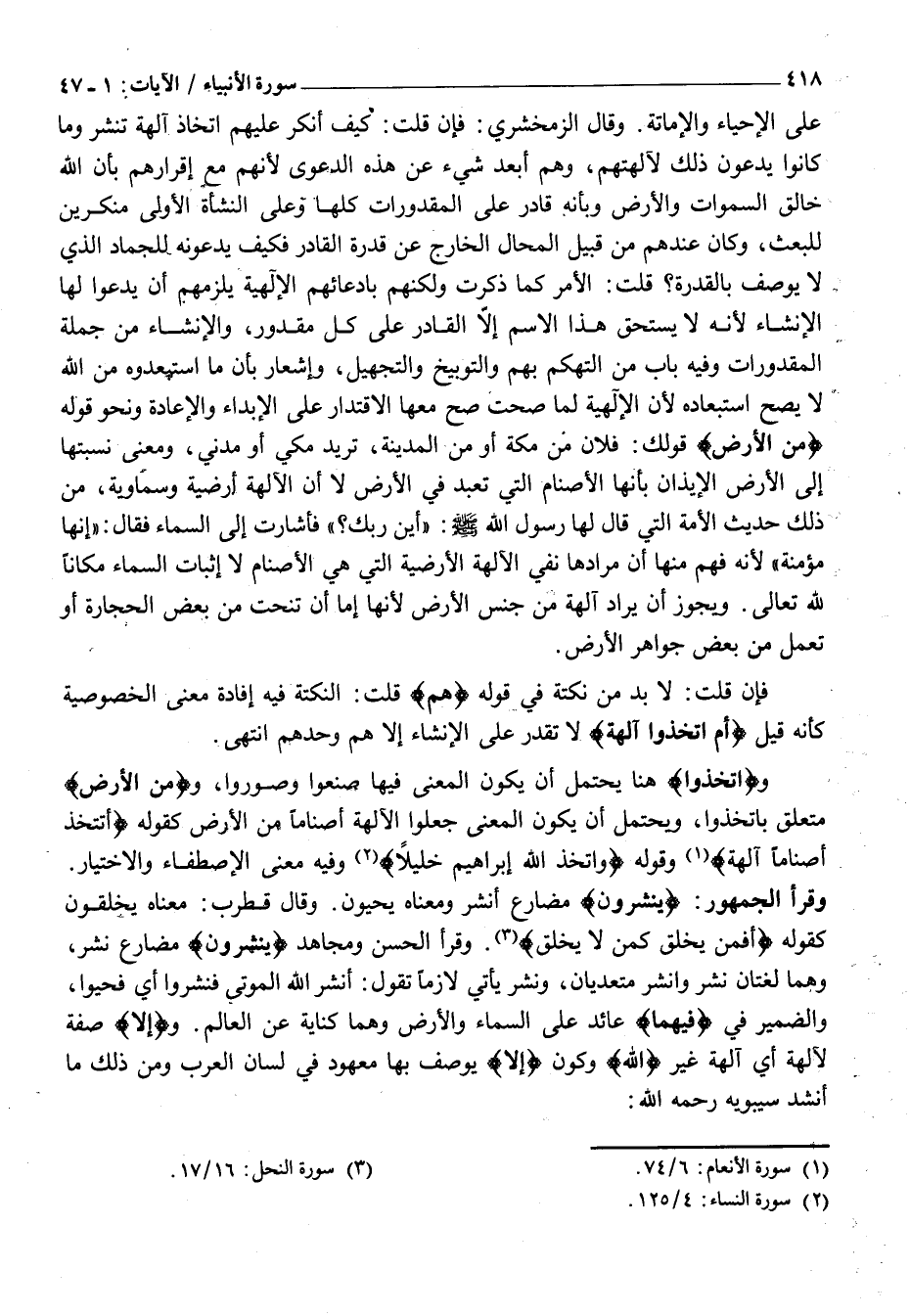 عَلَى الْإِحْيَاءِ وَالْإِمَاتَةِ. وَقَالَ الزَّمَخْشَرِيُّ: فَإِنْ قُلْتَ: كيف أَنْكَرَ عَلَيْهِمُ اتِّخَاذَ آلِهَةٍ تُنْشِرُ وَمَا كَانُوا يَدَّعُونَ ذَلِكَ لِآلِهَتِهِمْ، وَهُمْ أَبْعَدُ شَيْءٍ عَنْ هَذِهِ الدَّعْوَى لِأَنَّهُمْ مَعَ إِقْرَارِهِمْ بِأَنَّ الله خالق السموات وَالْأَرْضِ وَبِأَنَّهُ قَادِرٌ عَلَى الْمَقْدُورَاتِ كُلِّهَا وَعَلَى النَّشْأَةِ الْأُولَى مُنْكِرِينَ لِلْبَعْثِ، وَكَانَ عِنْدَهُمْ مِنْ قَبِيلِ الْمُحَالِ الْخَارِجِ عَنْ قُدْرَةِ الْقَادِرِ فَكَيْفَ يَدَّعُونَهُ لِلْجَمَادِ الَّذِي لَا يُوصَفُ بِالْقُدْرَةِ؟ قُلْتُ: الْأَمْرُ كَمَا ذَكَرْتَ وَلَكِنَّهُمْ بِادِّعَائِهِمُ الْإِلَهِيَّةَ يَلْزَمُهُمْ أَنْ يَدَّعُوا لَهَا الْإِنْشَاءَ لِأَنَّهُ لَا يَسْتَحِقُّ هَذَا الِاسْمَ إِلَّا الْقَادِرُ عَلَى كُلِّ مَقْدُورٍ، وَالْإِنْشَاءُ مِنْ جُمْلَةِ الْمَقْدُورَاتِ وَفِيهِ بَابٌ مِنَ التَّهَكُّمِ بِهِمْ وَالتَّوْبِيخِ وَالتَّجْهِيلِ، وَإِشْعَارٌ بِأَنَّ مَا اسْتَبْعَدُوهُ مِنَ اللَّهِ لَا يَصِحُّ اسْتِبْعَادُهُ لِأَنَّ الْإِلَهِيَّةَ لَمَّا صَحَّتْ صَحَّ مَعَهَا الِاقْتِدَارُ عَلَى الْإِبْدَاءِ وَالْإِعَادَةِ وَنَحْوُ قَوْلِهِ مِنَ الْأَرْضِ قَوْلُكَ: فُلَانٌ مِنْ مَكَّةَ أَوْ من المدينة، تريد مكي أو مدني، وَمَعْنَى نِسْبَتِهَا إِلَى الْأَرْضِ الْإِيذَانُ بِأَنَّهَا الْأَصْنَامُ الَّتِي تُعْبَدُ فِي الْأَرْضِ لَا أَنَّ الْآلِهَةَ أَرْضِيَّةٌ وَسَمَاوِيَّةٌ، مِنْ ذَلِكَ حَدِيثُ الْأَمَةِ الَّتِي