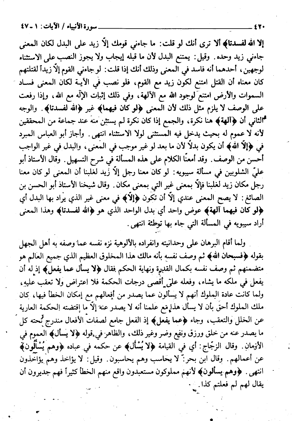 إِلَّا اللَّهُ لَفَسَدَتا أَلَا تَرَى أَنَّكَ لَوْ قُلْتَ: مَا جَاءَنِي قَوْمُكَ إِلَّا زَيْدٌ عَلَى الْبَدَلِ لَكَانَ الْمَعْنَى جَاءَنِي زَيْدٌ وَحْدَهُ. وَقِيلَ: يَمْتَنِعُ الْبَدَلُ لِأَنَّ مَا قَبْلَهُ إِيجَابٌ وَلَا يَجُوزُ النَّصْبُ عَلَى الْاسْتِثْنَاءِ لِوَجْهَيْنِ، أَحَدُهُمَا أَنَّهُ فَاسِدٌ فِي الْمَعْنَى وَذَلِكَ أَنَّكَ إِذَا قُلْتَ: لَوْ جَاءَنِي الْقَوْمُ إِلَّا زَيْدًا لَقَتَلْتُهُمْ كَانَ مَعْنَاهُ أَنَّ الْقَتْلَ امْتَنَعَ لِكَوْنِ زَيْدٍ مَعَ الْقَوْمِ، فَلَوْ نُصِبَ فِي الْآيَةِ لكان المعنى فساد السموات وَالْأَرْضِ امْتَنَعَ لِوُجُودِ اللَّهِ مَعَ الْآلِهَةِ، وَفِي ذَلِكَ إِثْبَاتُ الْإِلَهِ مَعَ اللَّهِ، وَإِذَا رُفِعَتْ عَلَى الْوَصْفِ لَا يَلْزَمُ مِثْلُ ذَلِكَ لِأَنَّ الْمَعْنَى لَوْ كانَ فِيهِما غَيْرُ اللَّهُ لَفَسَدَتا. وَالْوَجْهُ الثَّانِي أَنْ آلِهَةٌ هُنَا نَكِرَةٌ، وَالْجَمْعُ إِذَا كَانَ نَكِرَةً لَمْ يُسْتَثْنَ مِنْهُ عِنْدَ جَمَاعَةٍ مِنَ الْمُحَقِّقِينَ لِأَنَّهُ لَا عُمُومَ لَهُ بِحَيْثُ يَدْخُلُ فِيهِ الْمُسْتَثْنَى لَوْلَا الِاسْتِثْنَاءُ انْتَهَى. وَأَجَازَ أَبُو الْعَبَّاسِ الْمُبَرِّدُ فِي إِلَّا اللَّهُ أَنْ يَكُونَ بَدَلًا لِأَنَّ مَا بَعْدَ لَوْ غَيْرُ مُوجَبٍ فِي الْمَعْنَى، وَالْبَدَلُ فِي غَيْرِ الْوَاجِبِ أَحْسَنُ مِنَ الْوَصْفِ. وَقَدْ أَمْعَنَّا الْكَلَامَ عَلَى هَذِهِ الْمَسْأَلَةِ فِي شَرْحِ التَّسْهِيلِ. وَقَالَ الْأُسْتَاذُ أَبُو عَلِيٍّ الشَّلَوْبِينُ فِي مَسْأَلَةِ سِيبَوَيْهِ: لَوْ كَانَ مَعَنَا رَجُلٌ إلّا زيد لَغَلَبْنَا أَنَّ الْمَعْنَى لَوْ كَانَ مَعَنَا رَجُلٌ مَكَانَ زَيْدٍ لَغَلَبْنَا فَإِلَّا بِمَعْنَى غَيْرِ الَّتِي بِمَعْنَى مَكَانٍ. وَقَالَ شَيْخُنَا الْأُسْتَاذُ أَبُو الْحَسَنِ بْنُ الصَّائِغِ: لَا يَصِحُّ الْمَعْنَى عِنْدِي إِلَّا أَنْ تَكُونَ إِلَّا فِي مَعْنَى غَيْرِ الَّذِي يُرَادُ بِهَا الْبَدَلُ أَيْ لَوْ كانَ فِيهِما آلِهَةٌ عِوَضٌ وَاحِدٌ أَيْ بَدَلُ الْوَاحِدِ الَّذِي هُوَ اللَّهُ لَفَسَدَتا وَهَذَا الْمَعْنَى أَرَادَ سِيبَوَيْهِ فِي الْمَسْأَلَةِ الَّتِي جَاءَ بِهَا تَوْطِئَةً انْتَهَى.