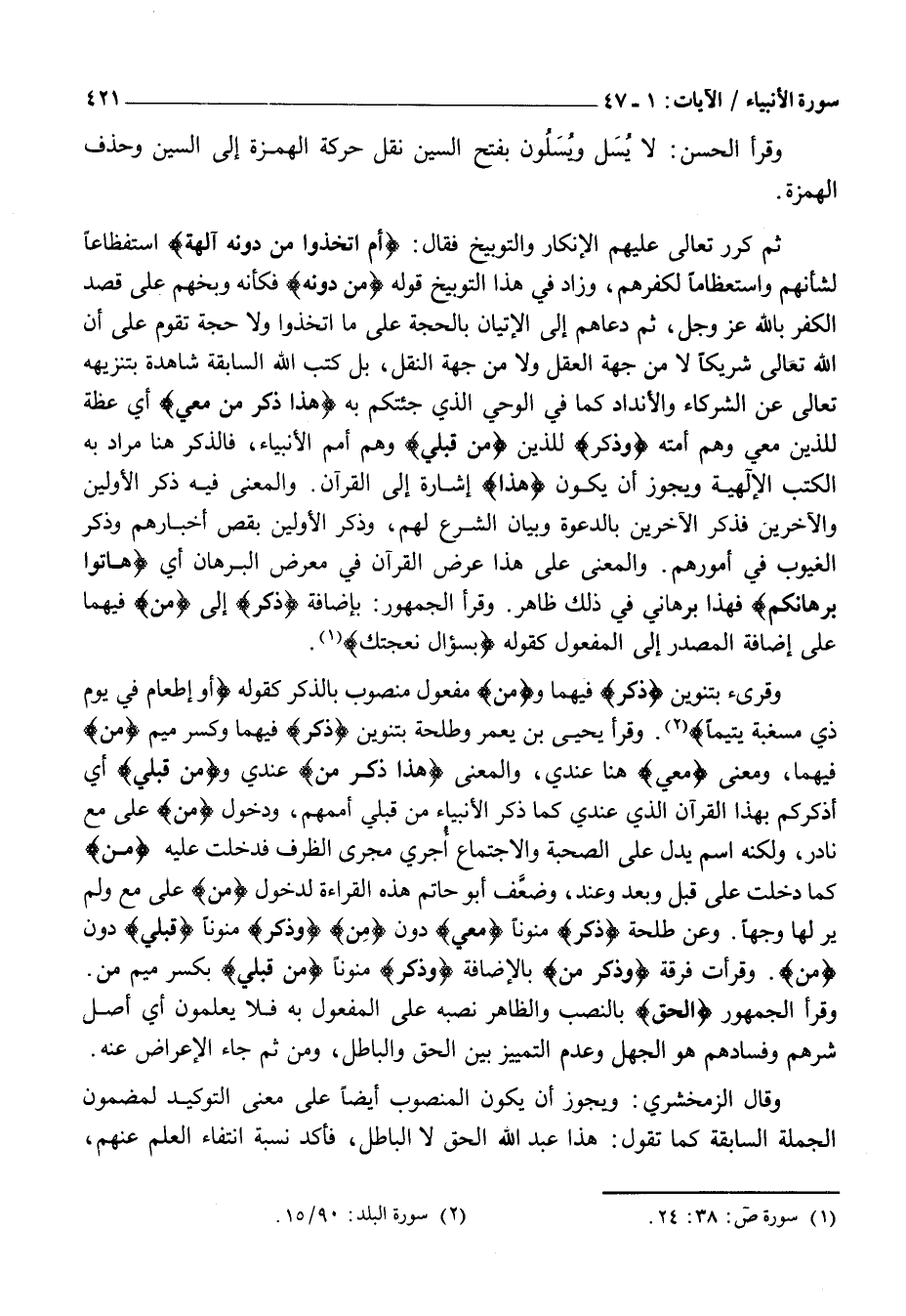 ثُمَّ كَرَّرَ تَعَالَى عَلَيْهِمُ الْإِنْكَارَ وَالتَّوْبِيخَ فَقَالَ: أَمِ اتَّخَذُوا مِنْ دُونِهِ آلِهَةً اسْتِفْظَاعًا لِشَأْنِهِمْ وَاسْتِعْظَامًا لِكُفْرِهِمْ، وَزَادَ فِي هَذَا التَّوْبِيخِ قَوْلُهُ مِنْ دُونِهِ فَكَأَنَّهُ وَبَّخَهُمْ عَلَى قَصْدِ الْكُفْرِ بِاللَّهِ عَزَّ وَجَلَّ، ثُمَّ دَعَاهُمْ إِلَى الْإِتْيَانِ بِالْحُجَّةِ عَلَى مَا اتَّخَذُوا وَلَا حُجَّةَ تَقُومُ عَلَى أَنَّ اللَّهَ تَعَالَى شَرِيكًا لَا مِنْ جِهَةِ الْعَقْلِ وَلَا مِنْ جِهَةِ النَّقْلِ، بَلْ كُتُبُ اللَّهِ السَّابِقَةُ شَاهِدَةٌ بِتَنْزِيهِهِ تَعَالَى عَنِ الشُّرَكَاءِ وَالْأَنْدَادِ كَمَا فِي الْوَحْيِ الَّذِي جِئْتُكُمْ بِهِ هَذَا ذِكْرُ مَنْ مَعِيَ أَيْ عِظَةٌ لِلَّذِينَ مَعِي وَهُمْ أُمَّتُهُ وَذِكْرُ لِلَّذِينَ مَنْ قَبْلِي وَهُمْ أُمَمُ الْأَنْبِيَاءِ، فَالذِّكْرُ هُنَا مُرَادٌ بِهِ الْكُتُبُ الْإِلَهِيَّةُ وَيَجُوزُ أَنْ يَكُونَ هَذَا إِشَارَةٌ إِلَى الْقُرْآنِ. وَالْمَعْنَى فِيهِ ذِكْرُ الْأَوَّلِينَ وَالْآخِرِينَ فَذِكْرُ الْآخِرِينَ بِالدَّعْوَةِ وَبَيَانِ الشَّرْعِ لَهُمْ، وَذِكْرُ الْأَوَّلِينَ بِقَصِّ أَخْبَارِهِمْ وَذِكْرِ الْغُيُوبِ فِي أُمُورِهِمْ. وَالْمَعْنَى عَلَى هَذَا عَرْضُ الْقُرْآنِ فِي مَعْرِضِ الْبُرْهَانِ أَيْ هاتُوا بُرْهانَكُمْ فَهَذَا بُرْهَانِي فِي ذَلِكَ ظَاهِرٌ. وَقَرَأَ الْجُمْهُورُ: بِإِضَافَةِ ذِكْرُ إِلَى مِنْ فِيهِمَا عَلَى إِضَافَةِ الْمَصْدَرِ إِلَى الْمَفْعُولِ كَقَوْلِهِ بِسُؤالِ نَعْجَتِكَ «1» .